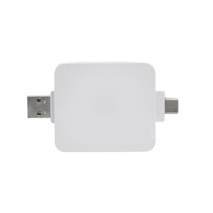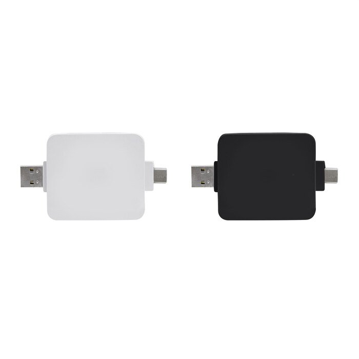 Mini adaptador HUB multipuerto. Entrada: 1 x USB-A / 1 x USB-C. Salida: 2 x USB-A / 2 x USB-C con conectores rebatibles. Medidas: 5,2 x 4,6 x 1,3 cm. Materiales: Plástico