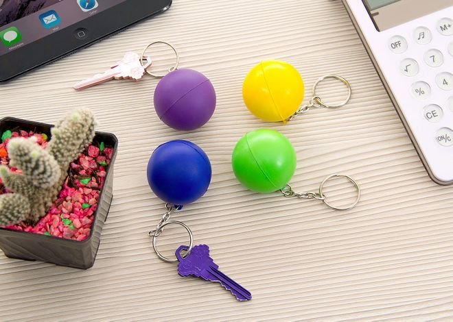 Llavero desestresante en forma de bola. MATERIAL: PU (Poliuretano). MEDIDAS: Diámetro de 3,9 cm. MARCA: SE SUGIERE: Tampografía para Antiestrés 1 tinta.