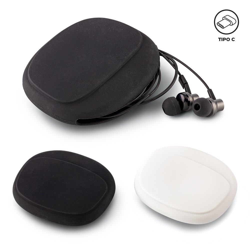 Audífonos plásticos con conexión Tipo C en estuche de silicona. Funcionan como manos libres (control de volumen). Medidas Estuche: 9 cm x 7.5 cm x 1.7 cm.