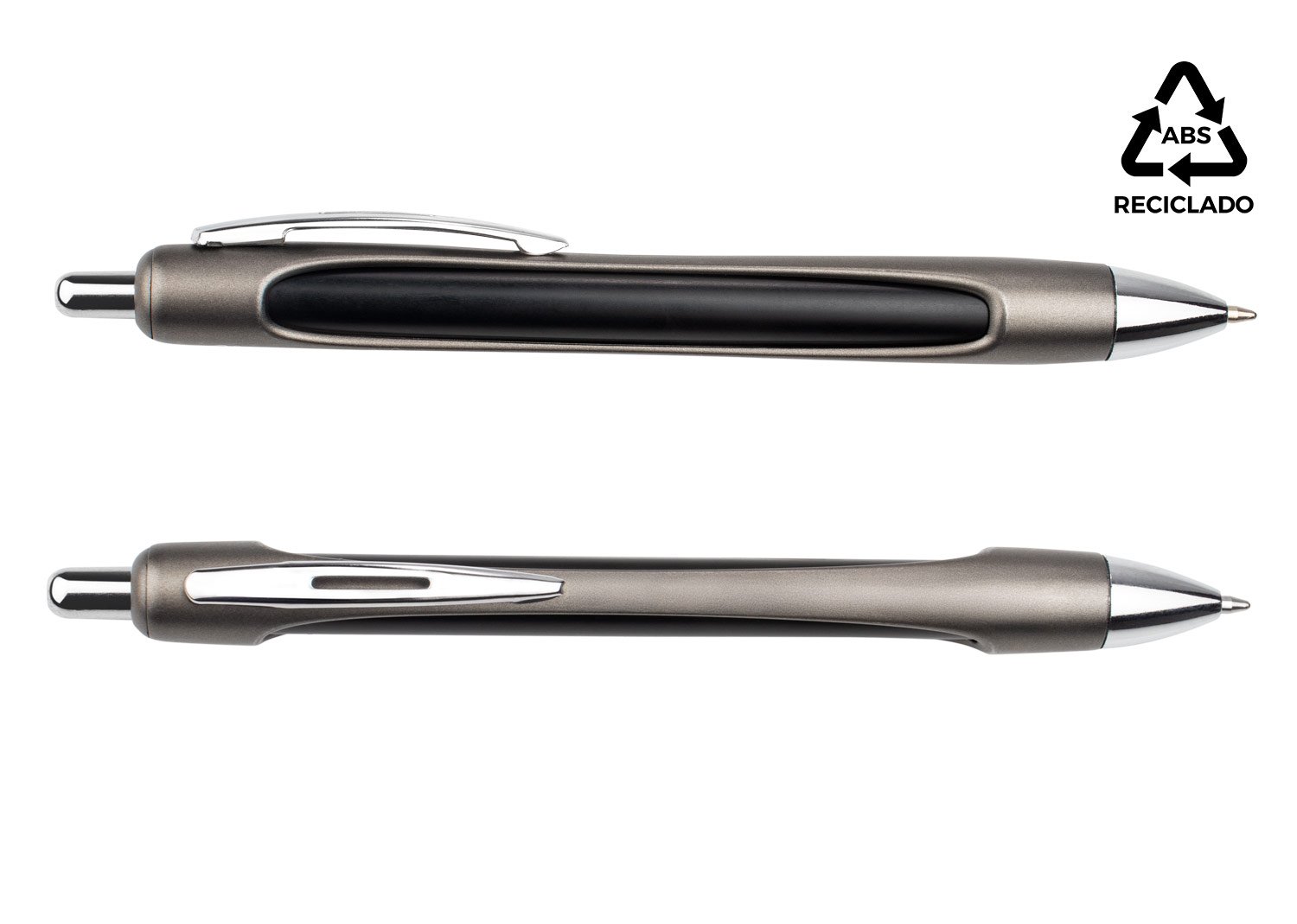 Bolígrafo de acción retráctil con diseño metálico y materiales reciclados. Cuerpo exterior en ABS reciclado con acabado metálico, interior de aluminio reciclado. Clip, botón y punta cromados. Incluye recambio tipo Parker de plástico. (Bolígrafo/Esfero). MATERIAL: Aluminio Reciclado + ABS. MEDIDAS: Formato: (Alto X Diámetro X Ancho con Clip): (14,3 X Ø 0,9 X 1,4 cm). Peso: 16 gr. MARCA: SE SUGIERE: Láser.