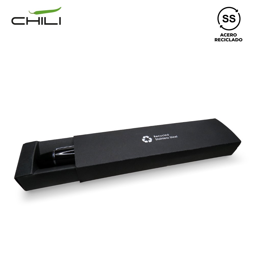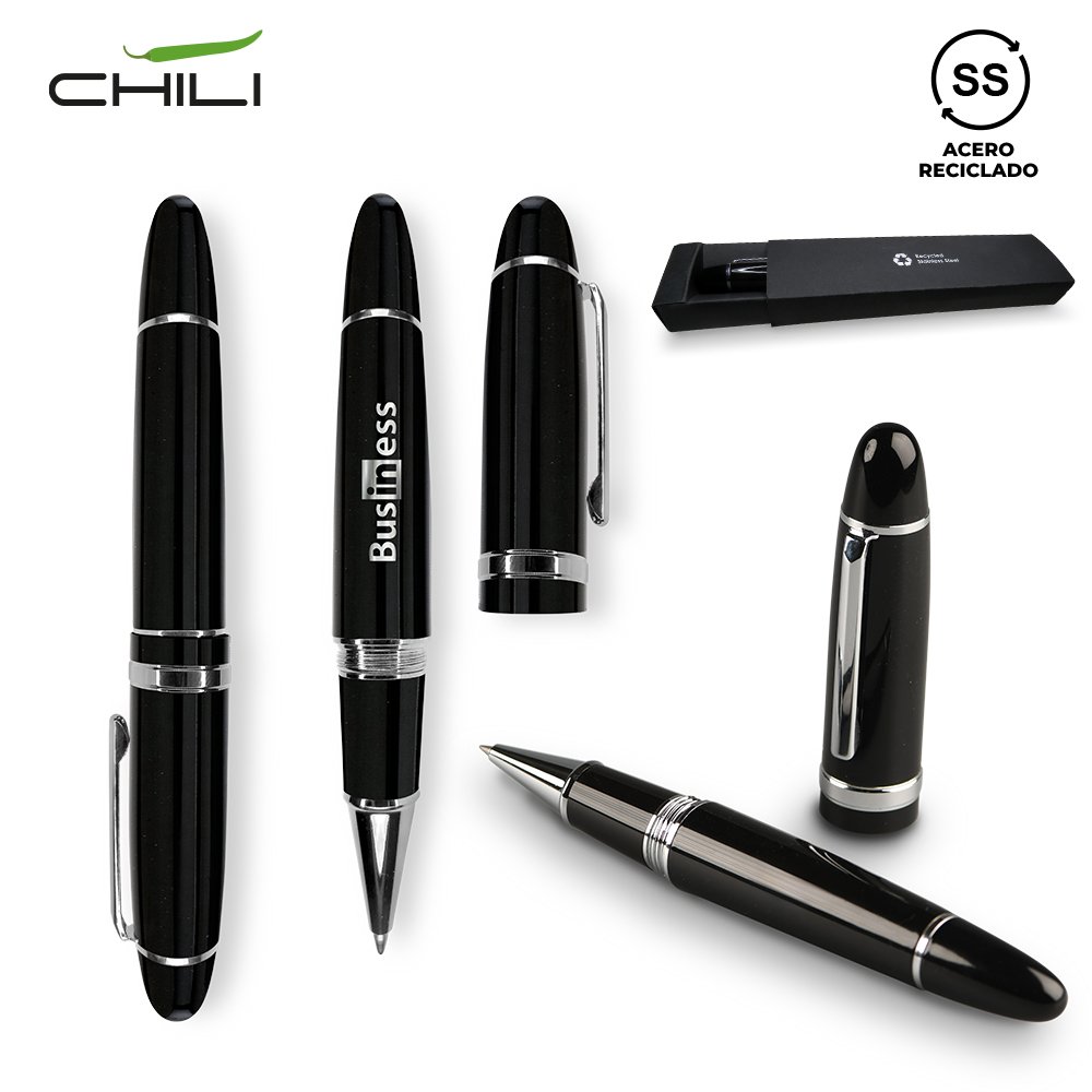 Bolígrafo roller en acero inoxidable reciclado, clip metálico y tapa rosca (incluye mina adicional). Empaque caja individual. Medidas: 14.5 cm. Caja: 17.6 cm X 4.6 cm X 2.2 cm. .