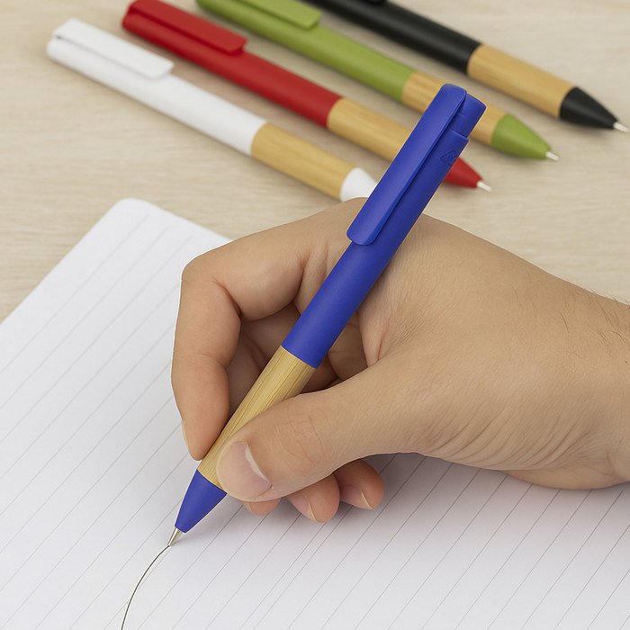 Bolígrafo retráctil. Cuerpo, puntera y pulsador de plástico reciclable. Agarre de bambú. Pintura acabado mate. Medidas: 1,1 x 14,3 cm Materiales: Plástico ABS reciclable y bambú Peso: 8,7 g