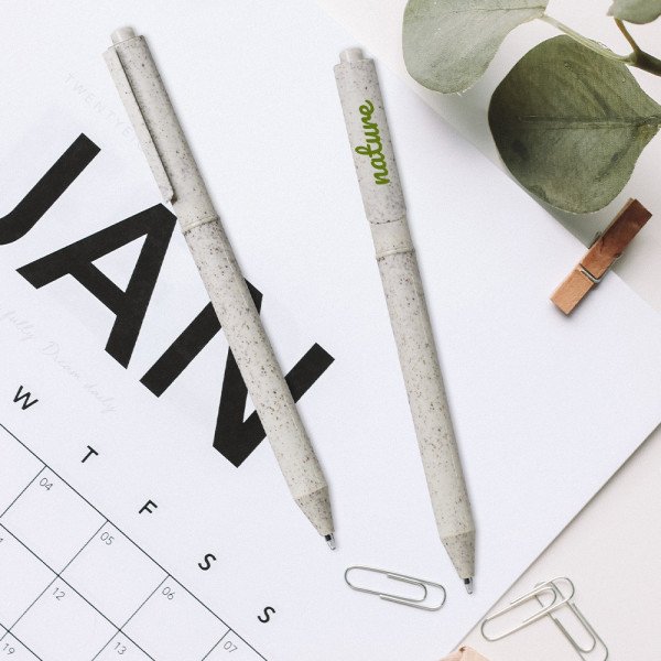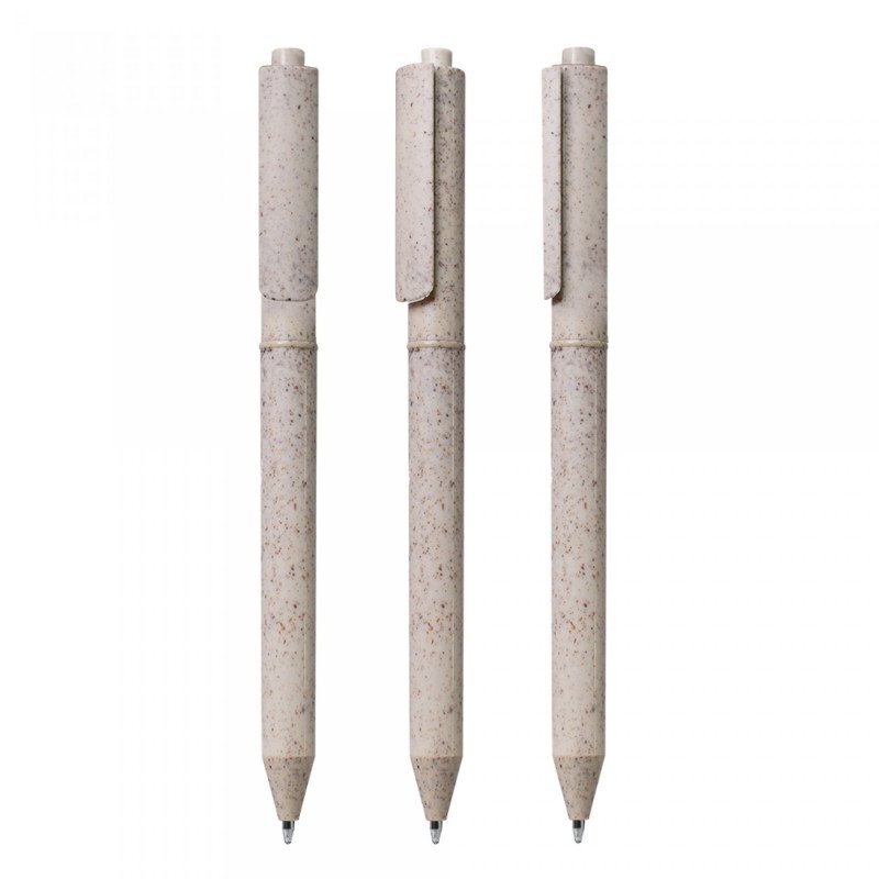 Bolígrafo elaborado en plástico de fibra de trigo (70% aproximado) que se biodegrada completamente en máximo 3 años.Impresión: Tampografía