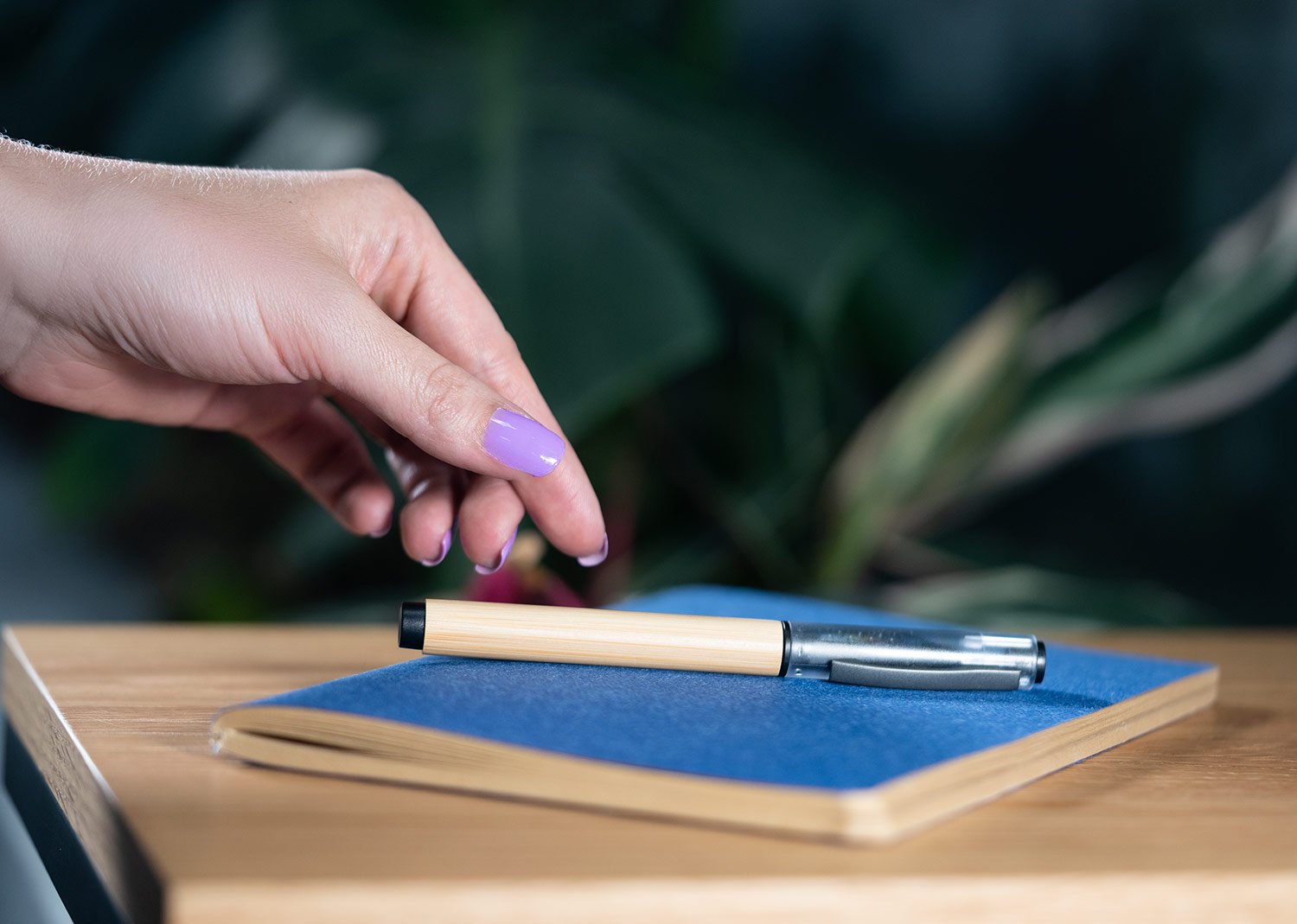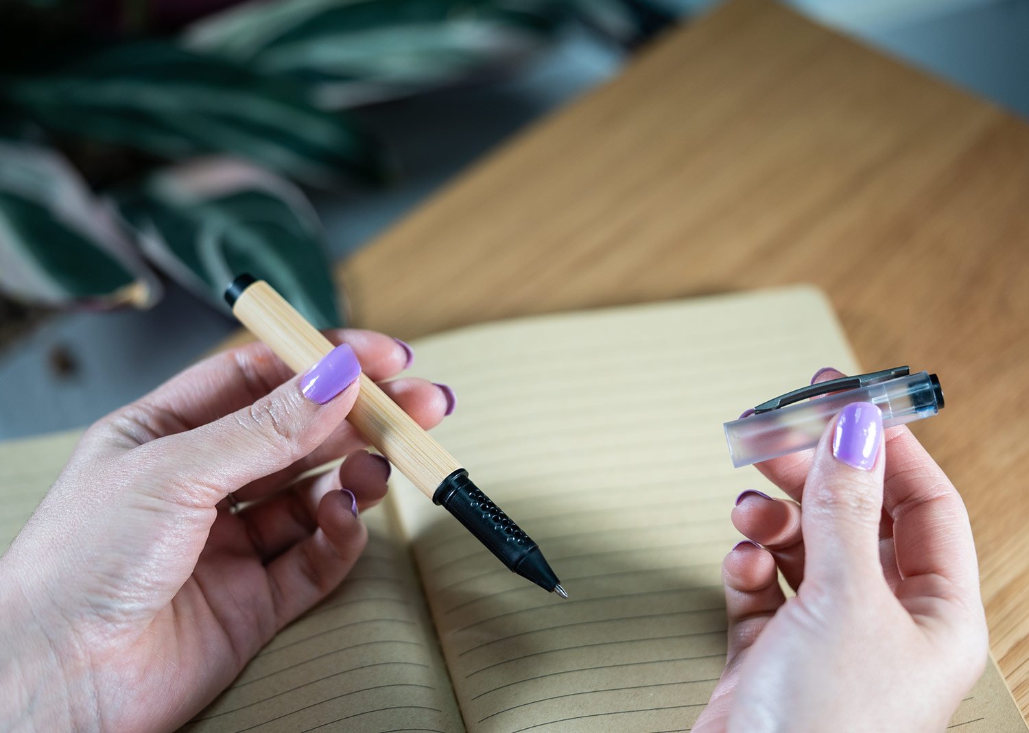 Bolígrafo con cuerpo de color sólido hecho en bambú, tapa transparente con clip metálico. Tinta de gel. Al retirar la tapa, el bolígrafo cuenta con detalles circulares. (Bolígrafo/Esfero). MATERIAL: Bambú + RPET. MEDIDAS: Formato: (Alto X Diámetro X Ancho con Clip): (13,9 X Ø 0,8 X 1,1). Peso: 9 gr.MARCA: SE SUGIERE: Tampografía con tratamiento