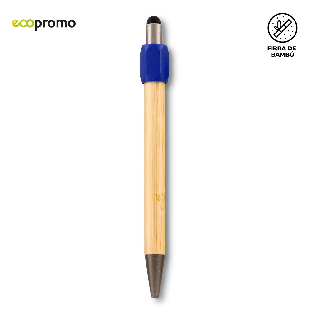 Bolígrafo en bambú con mecanismo push y stylus. Incluye un antiestresante giratorio. Medidas: 14.8 cm.
