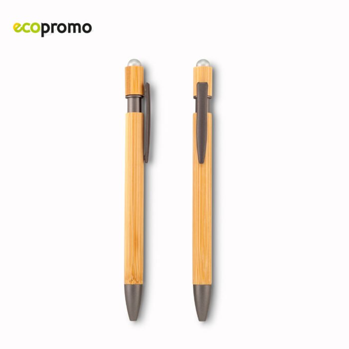 Bolígrafo en bambú con stylus. Mecanismo push y clip metálico. Medidas: 14.5 cm.. Marca: / Láser.