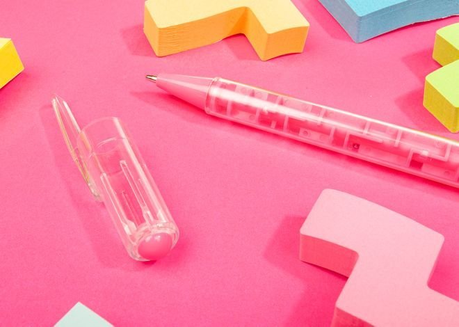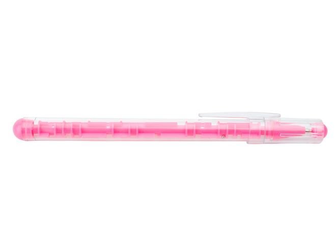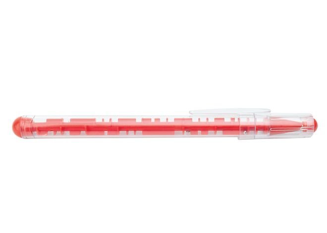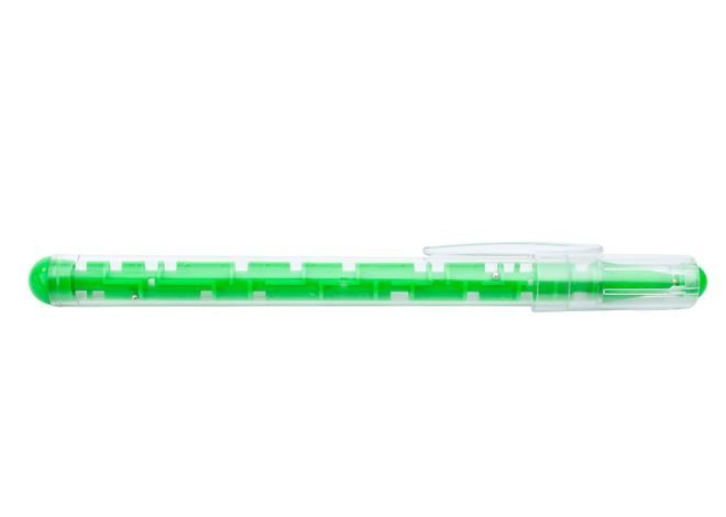 Bolígrafo plástico con tapa, en la parte interna tiene un jueego para disfrutar mientras se utiliza