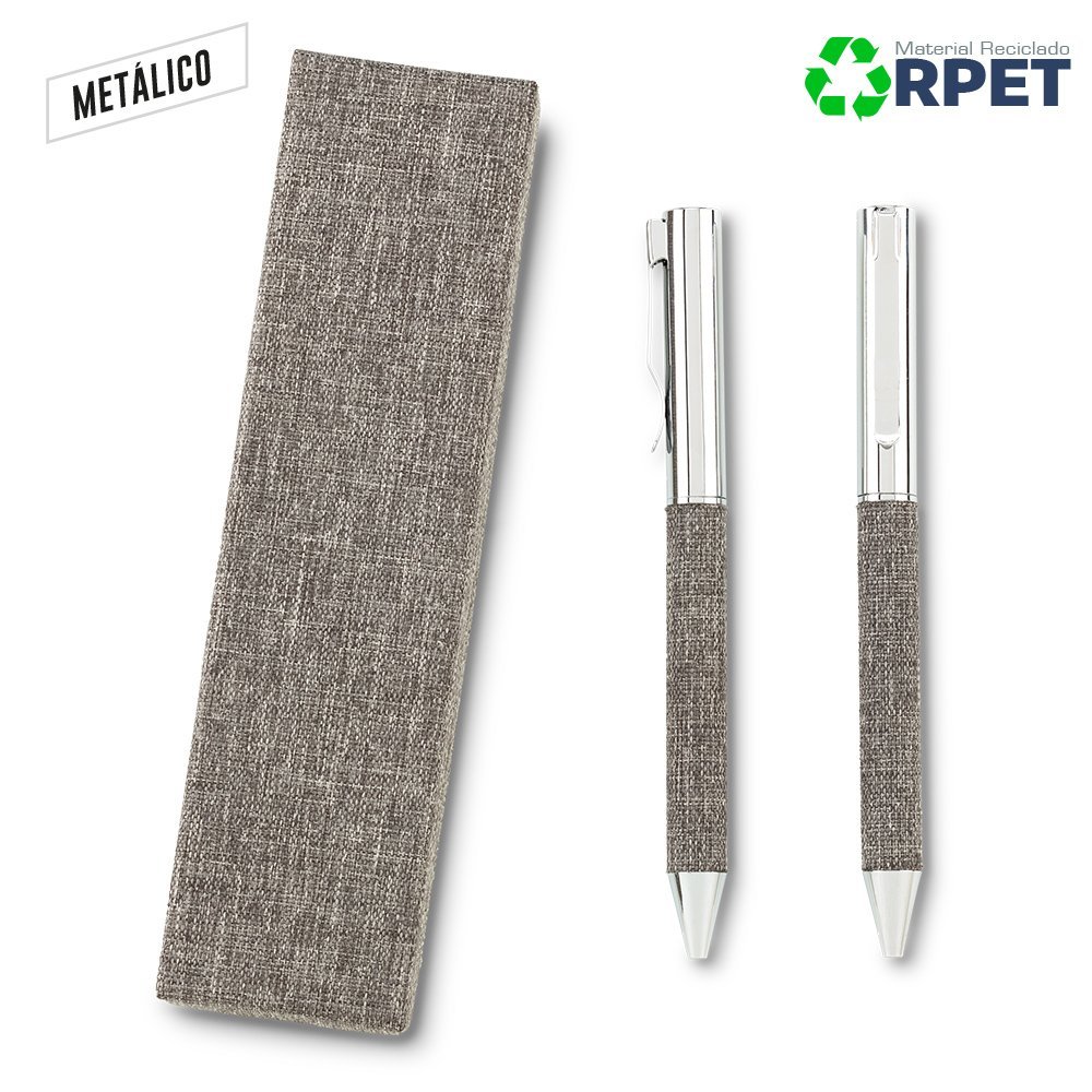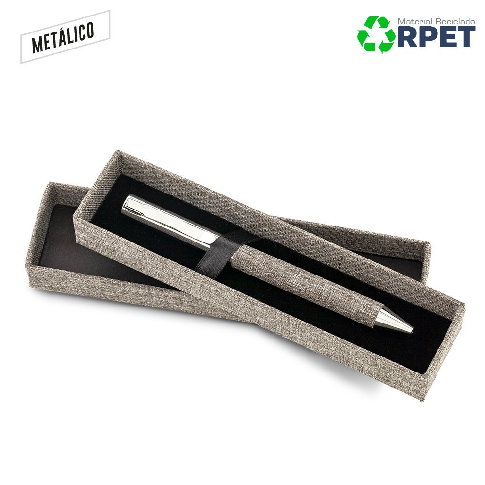 Bolígrafo metálico con grip en poliéster RPET. Estuche de cartón forrado con poliéster RPET. Mecanismo Twist. Medidas Bolígrafo: 13.5 cm. Medidas Estuche: 4 cm x 16 cm x 2.3 cm. Marca: / Láser