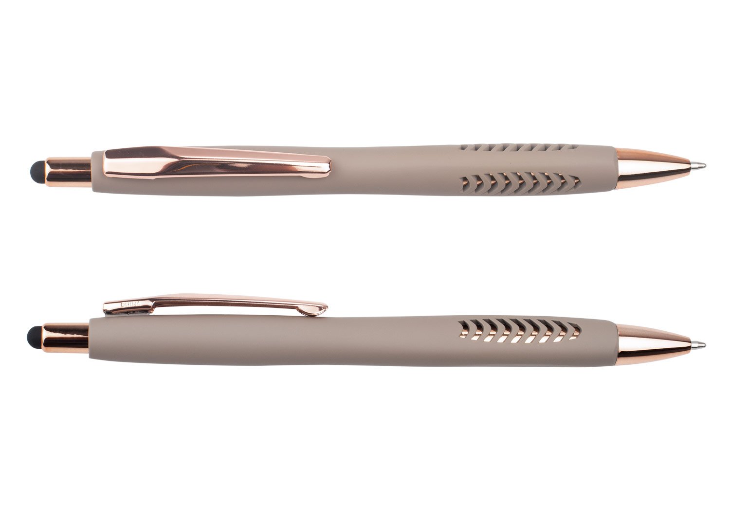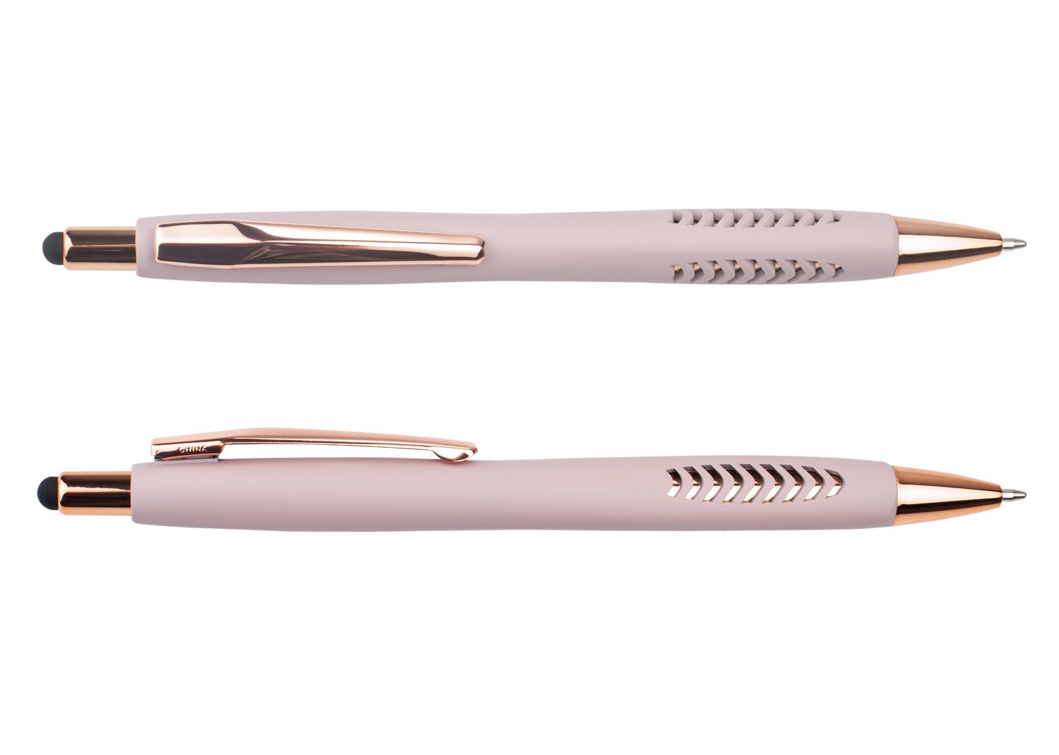 Bolígrafo con cuerpo de color sólido mate, suave al tacto, diseño sofisticado. Detalles metalizados rosa. Sistema de apertura retráctil con stylus para pantallas táctiles. En la parte inferior, contiene 2 detalles con hundimiento en forma de punta de flecha. MATERIAL: ABS MEDIDAS: Alto: 14,8 cm. Diámetro con clip: 1,2 cm. Diámetro sin clip: 0,7 cm. Peso: 16 gr.