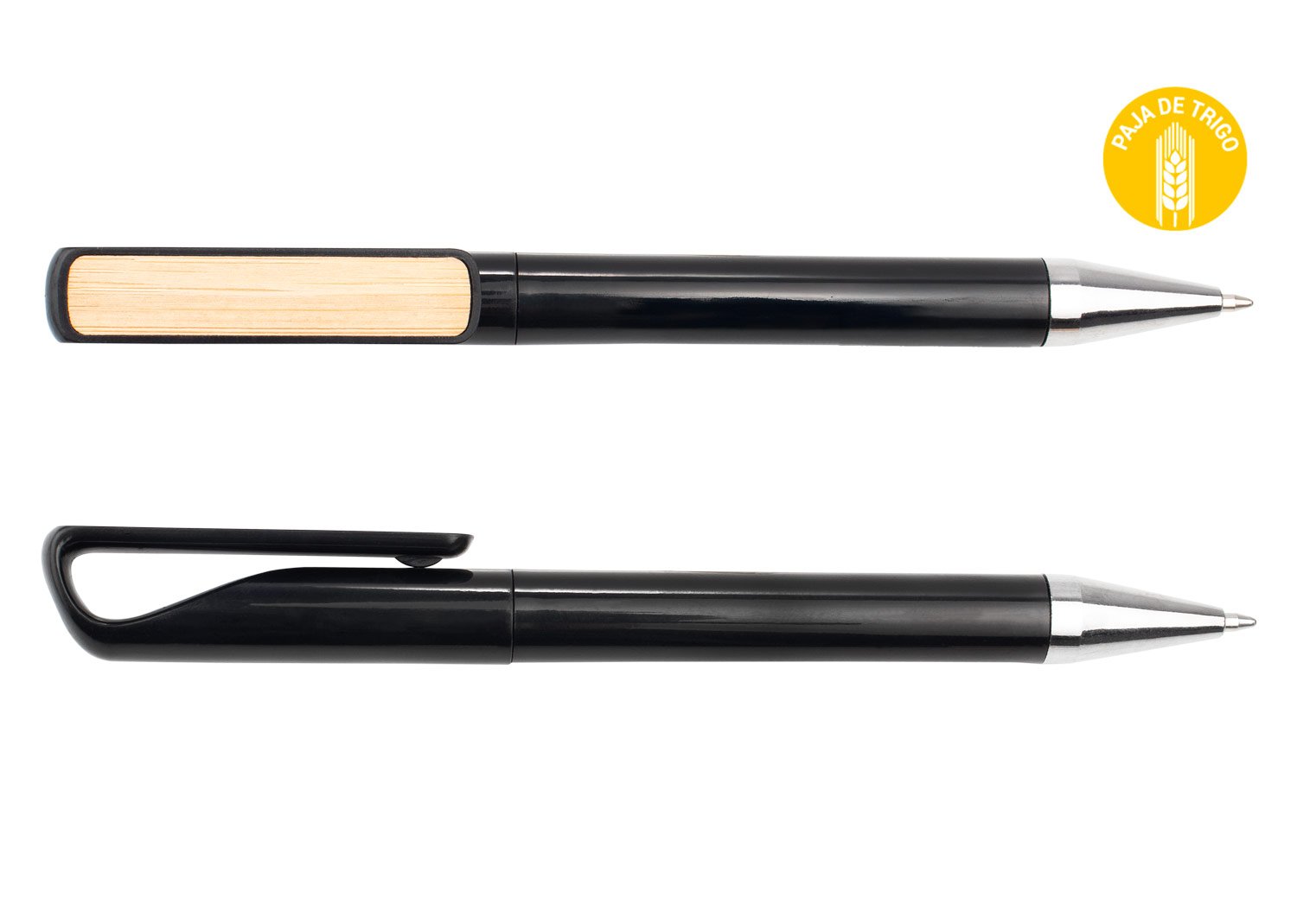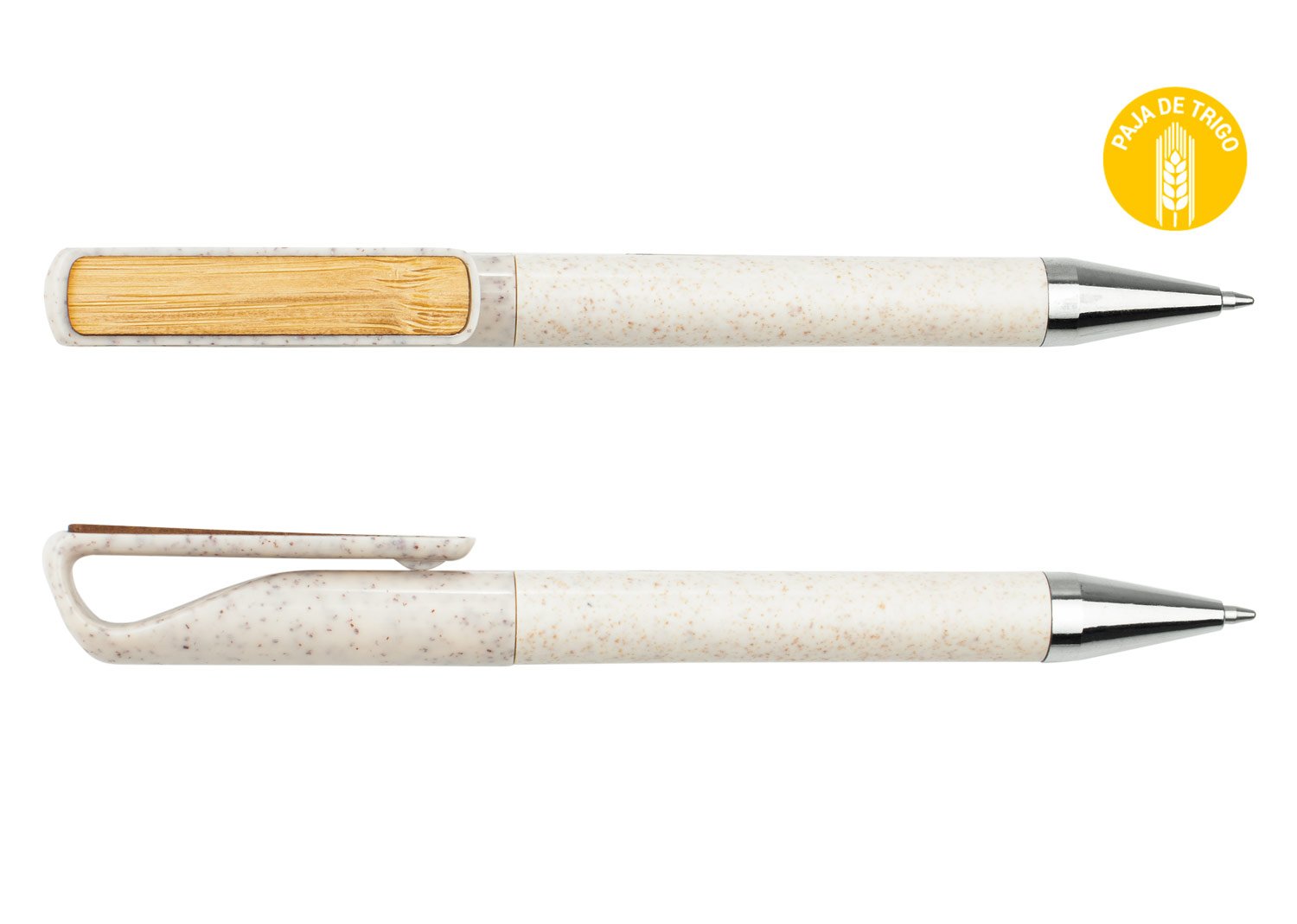 Bolígrafo hecho con paja de trigo coloreada, clip de bambú y detalles cromados. Sistema de apertura de giro. (Bolígrafo/Esfero). MATERIAL: Paja de Trigo + Bambú. MEDIDAS: Formato: (Alto X Diámetro X Ancho con Clip): (13,9 X Ø 0,8 X 1,2). Peso: 9 gr. MARCA: SE SUGIERE: Tampografía con tratamiento