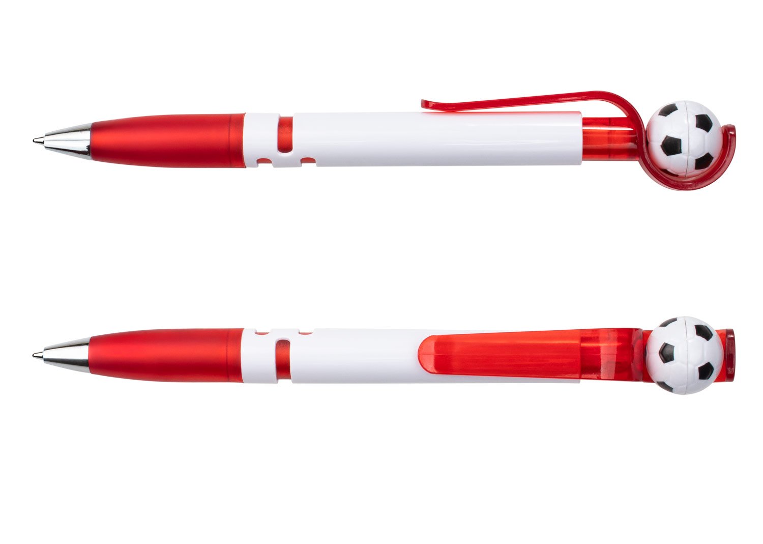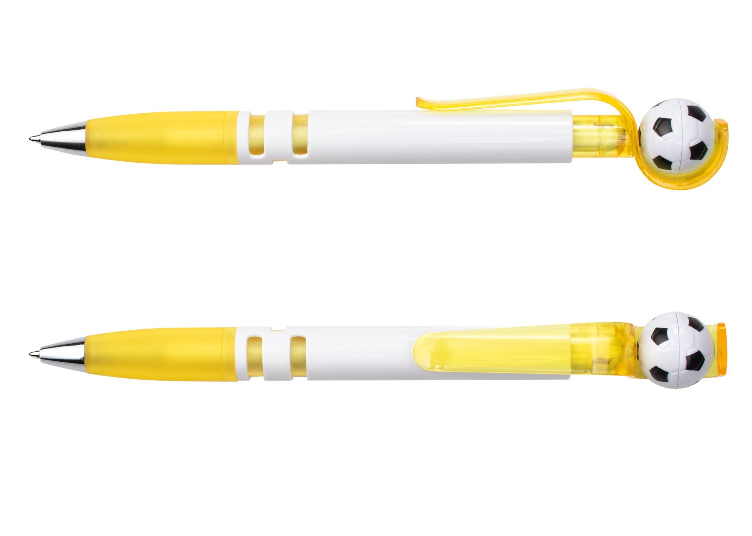 Con barril blanco sólido, clip y empujador traslúcidos que integran un mecanismo giratorio con balón de fútbol. Su empuñadura traslúcida brinda comodidad al escribir, mientras que la punta cromada aporta un toque moderno. El balón gira al impulsarlo, haciendo de este bolígrafo una opción divertida y funcional. MATERIAL: Plástico ABS MEDIDAS: Formato: (Alto X Diámetro X Ancho con Clip): (14,3 X Ø 1 X 1,4). Peso: 10 gr.