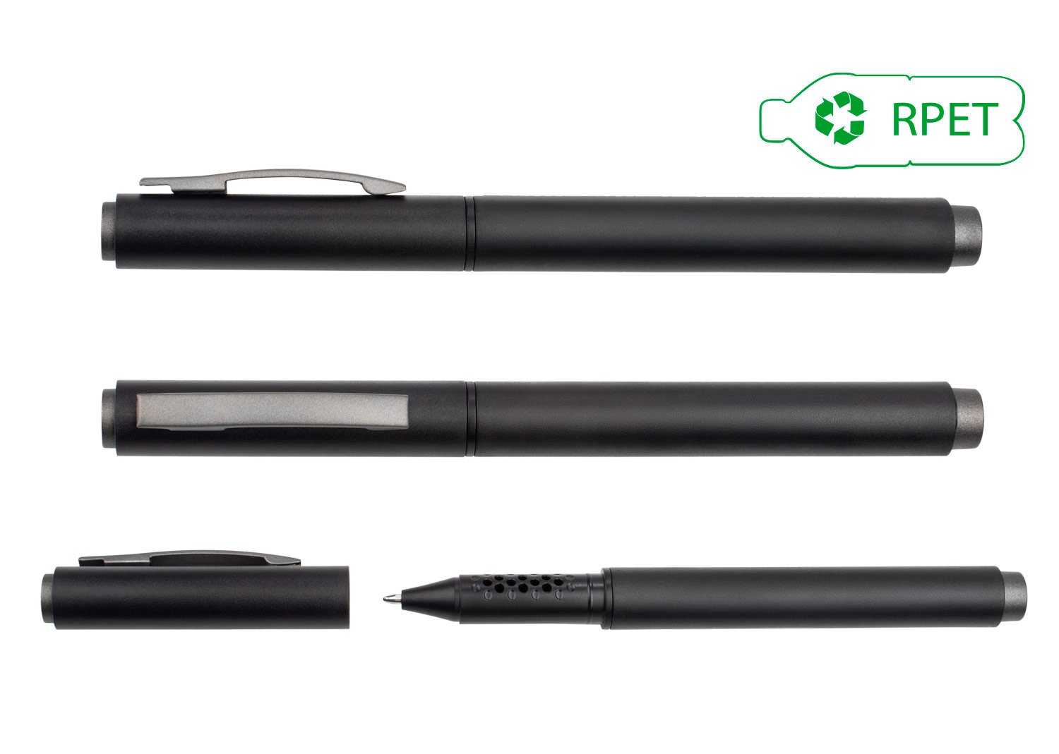 Bolígrafo con cuerpo de color sólido plástico RPET, clip metálico. Tinta de gel. Al retirar la tapa, el bolígrafo cuenta con detalles circulares. (Bolígrafo/Esfero). MATERIAL: RPET + Clip Metálico. MEDIDAS: Formato: (Alto X Diámetro X Ancho con Clip): (13,8 X Ø 0,8 X 1,2). Peso: 10 gr. MARCA: SE SUGIERE: Tampografía bolígrafos plásticos