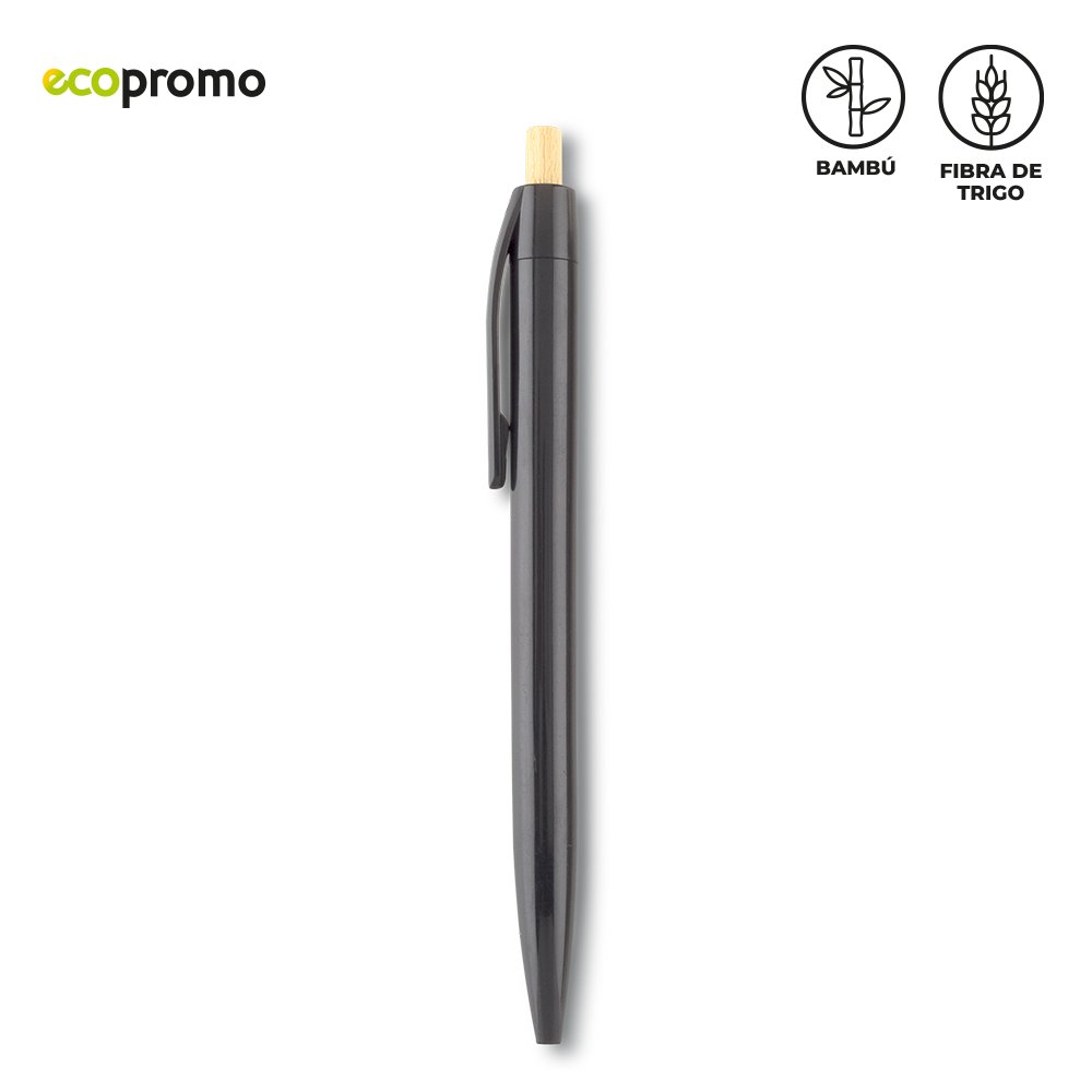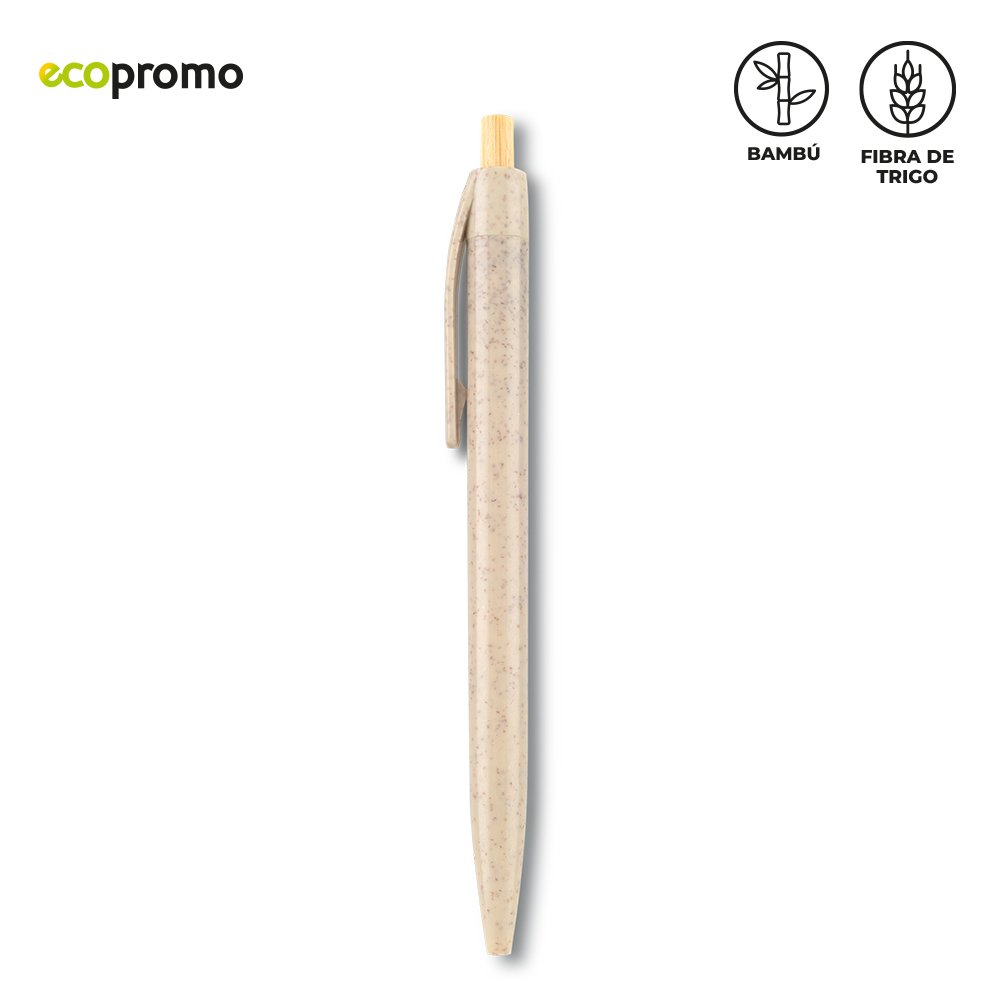 Bolígrafo plástico con mecanismo push en bambú. Mezcla con material ecológico en fibra de trigo. El porcentaje de material ecológico tiene un promedio de biodegradabilidad de 2-3 años después del fin de su vida útil. Medidas: 14 cm.