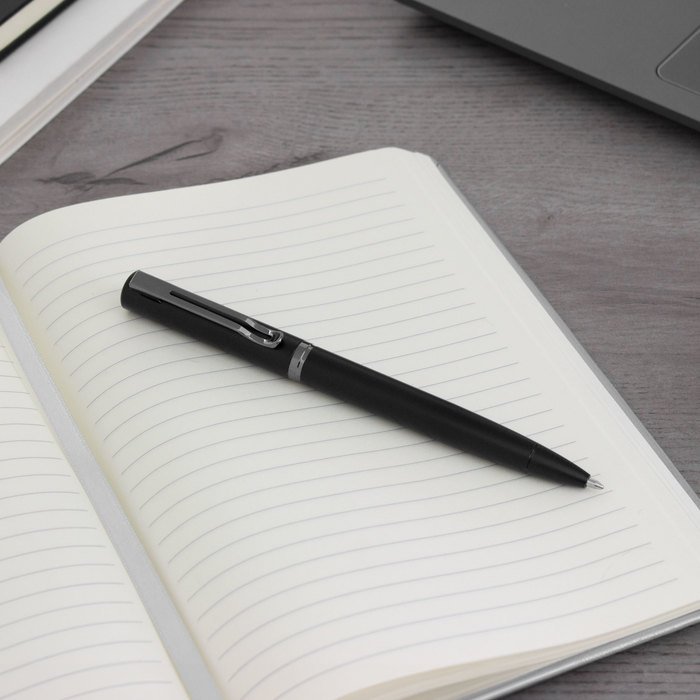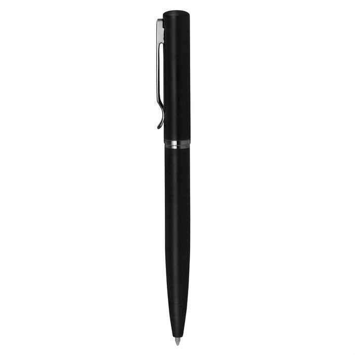 Bolígrafo con apertura giratoria. Cuerpo metálico en negro mate. Parte superior de hierro y parte inferior de acero inoxidable. Destape electroplateado en la parte superior. Recarga Parker metálico. Clip y anillos metálicos color gun. Medida: 13,5 cm. Material: Metal.