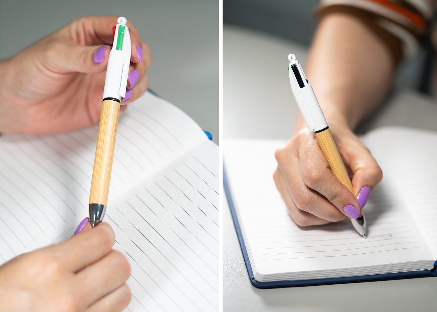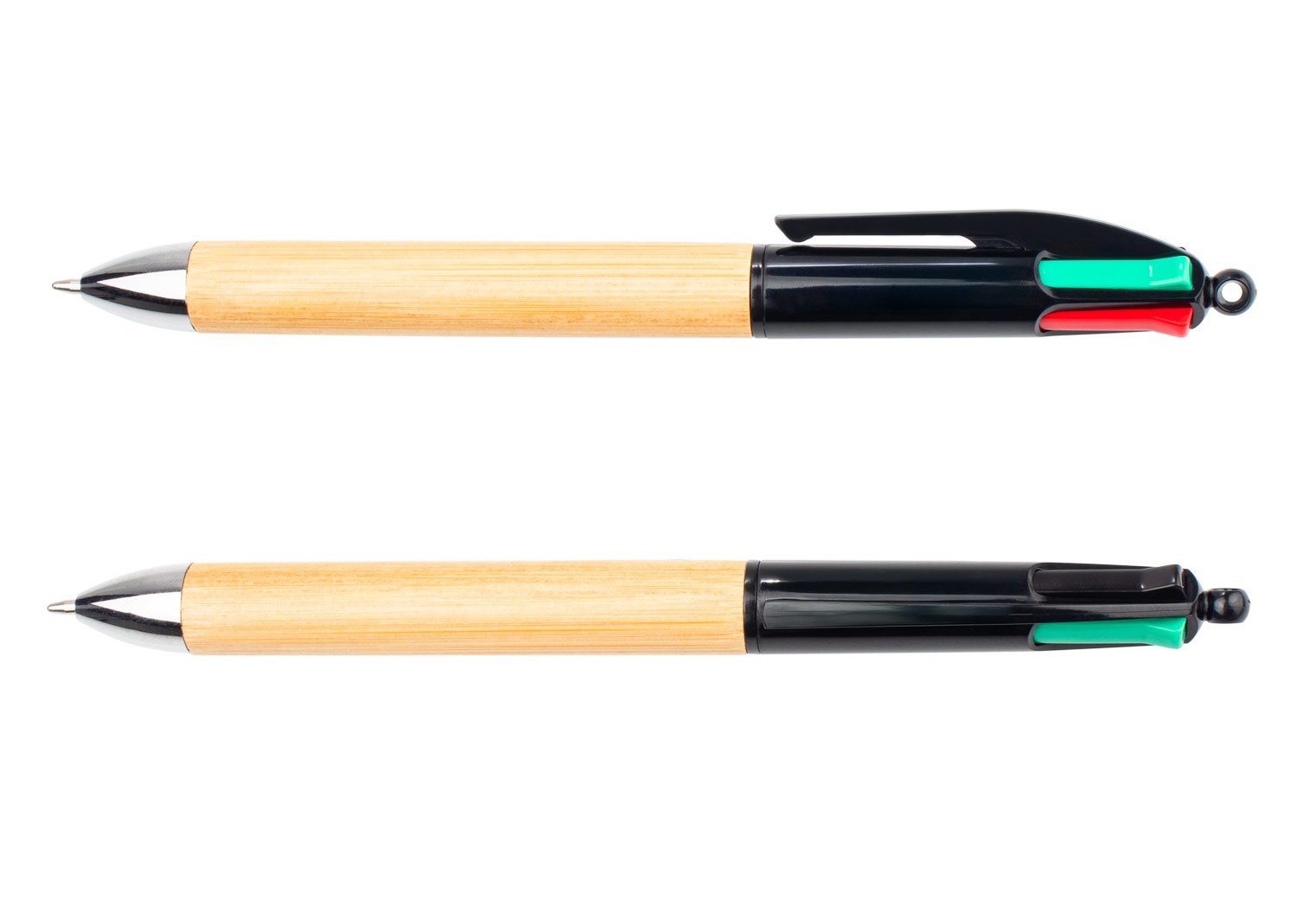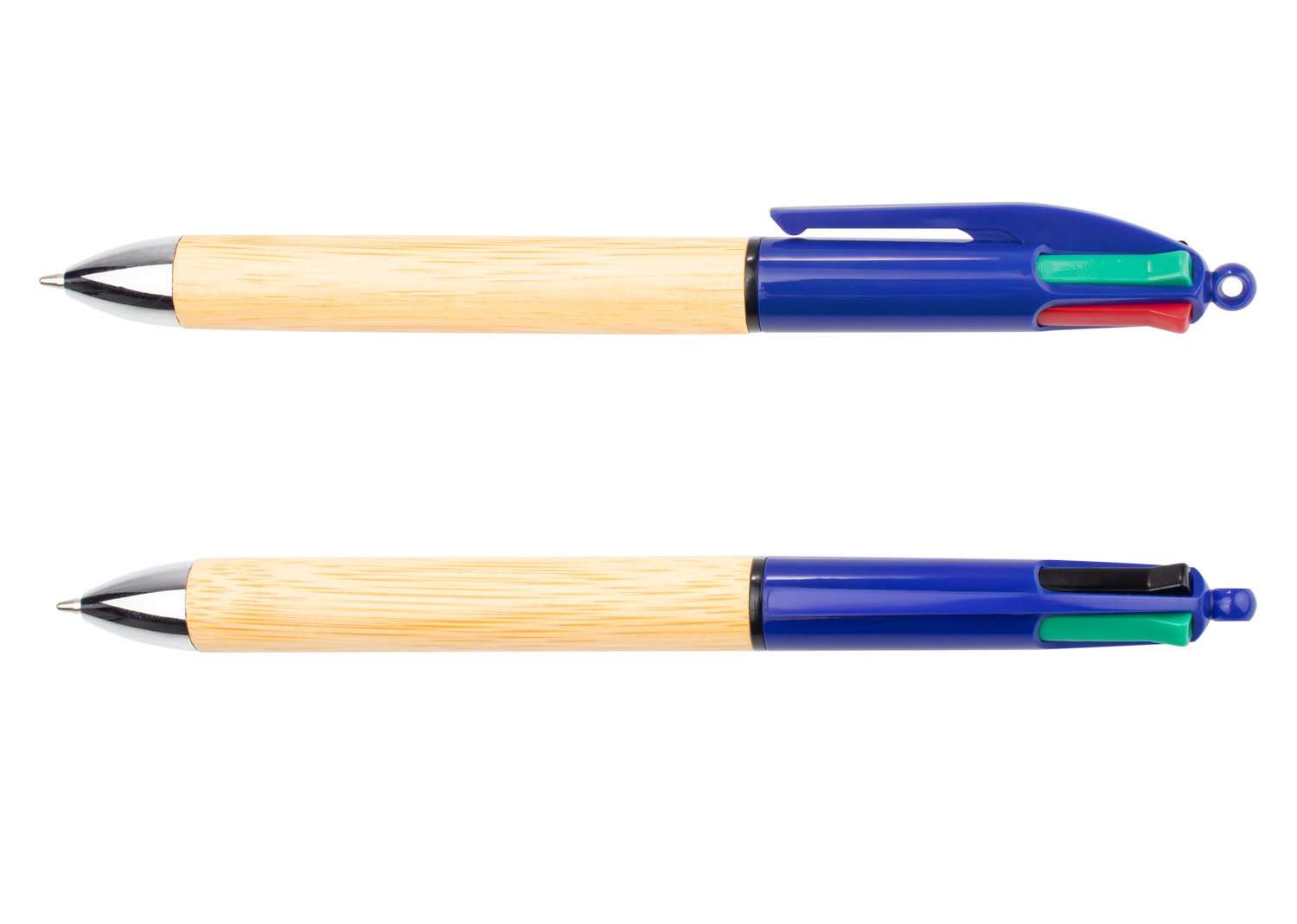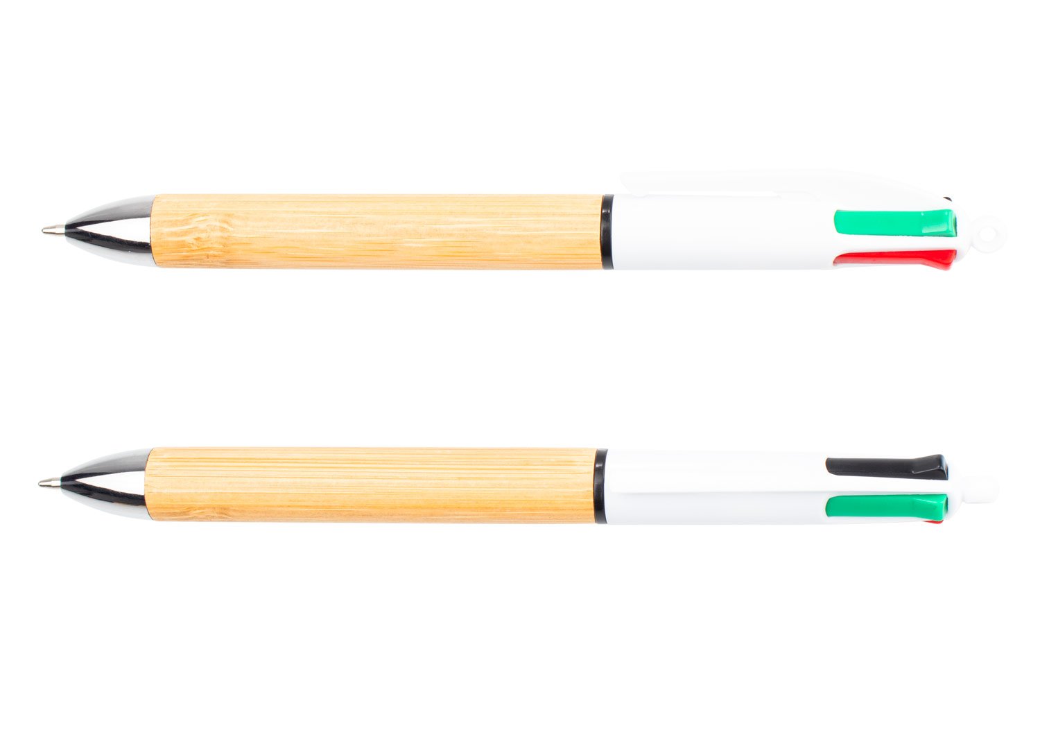 Bolígrafo con cuerpo de bambú, cuerpo superior de color sólido, punta cromada, incluye 4 minas de diferentes colores. (Bolígrafo/Esfero). MATERIAL: Bambú + ABS. MEDIDAS: Formato: (Alto X Diámetro X Ancho con Clip): (15 X Ø 0,8 X 1,2). Peso: 10 gr. MARCA: SE SUGIERE: Tampografía con tratamiento