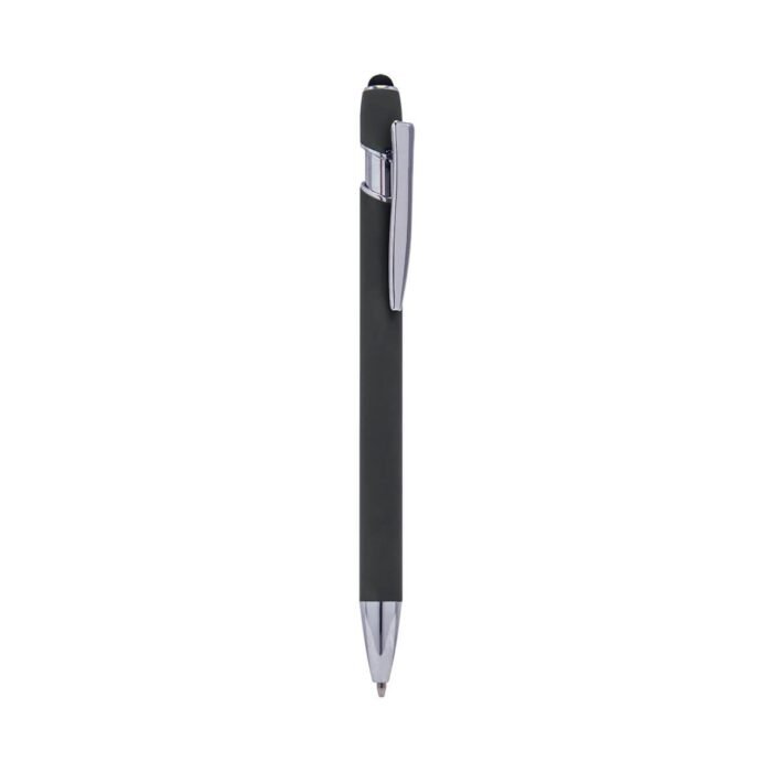 Bolígrafo con touch screen y terminado tipo rubber. Mecanismo pulsador. Incluye funda.