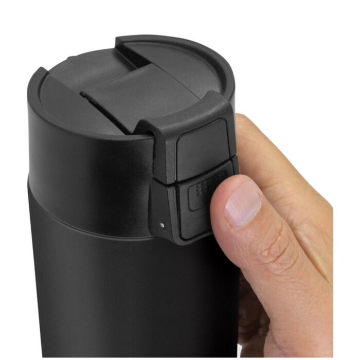Acero inoxidable. Capacidad 450 ml. Botella con aislamiento térmico vacuum. Interior de acero 304 y exterior de acero 201. Pintura acabado mate. Tapa en PP con traba de seguridad y botón pulsador de apertura. Mantiene por más de 12 hs la temperatura de las bebidas calientes y 24 hs de las bebidas frías. Presentación en caja de regalo kraft.Ø 7 cm x 23 cm.