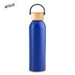 Metálico, en aluminio. Con tapa rosca y parte superior en bambú. No apto para bebidas calientes.
