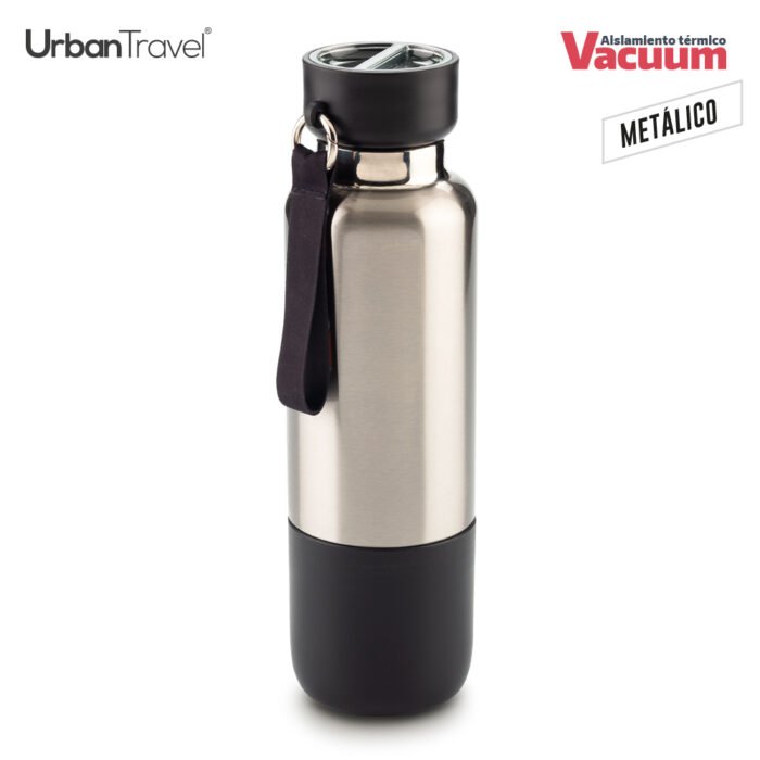 Botilito doble pared vacuum en acero inoxidable, con aislamiento térmico que mantiene la bebida fría o caliente hasta 6h, aprox (puede variar dependiendo condiciones climáticas). Con tapa rosca plástica la cual funciona para guardar una cinta porta botilito. Inlcuye cinta para cargar y base funciona de vaso. Empaque caja individual. Medidas: 26 cm x 7 cm diámetro. Marca: / Tampografía, producto con tratamiento / Láser (Liquído Oxidante en silver).