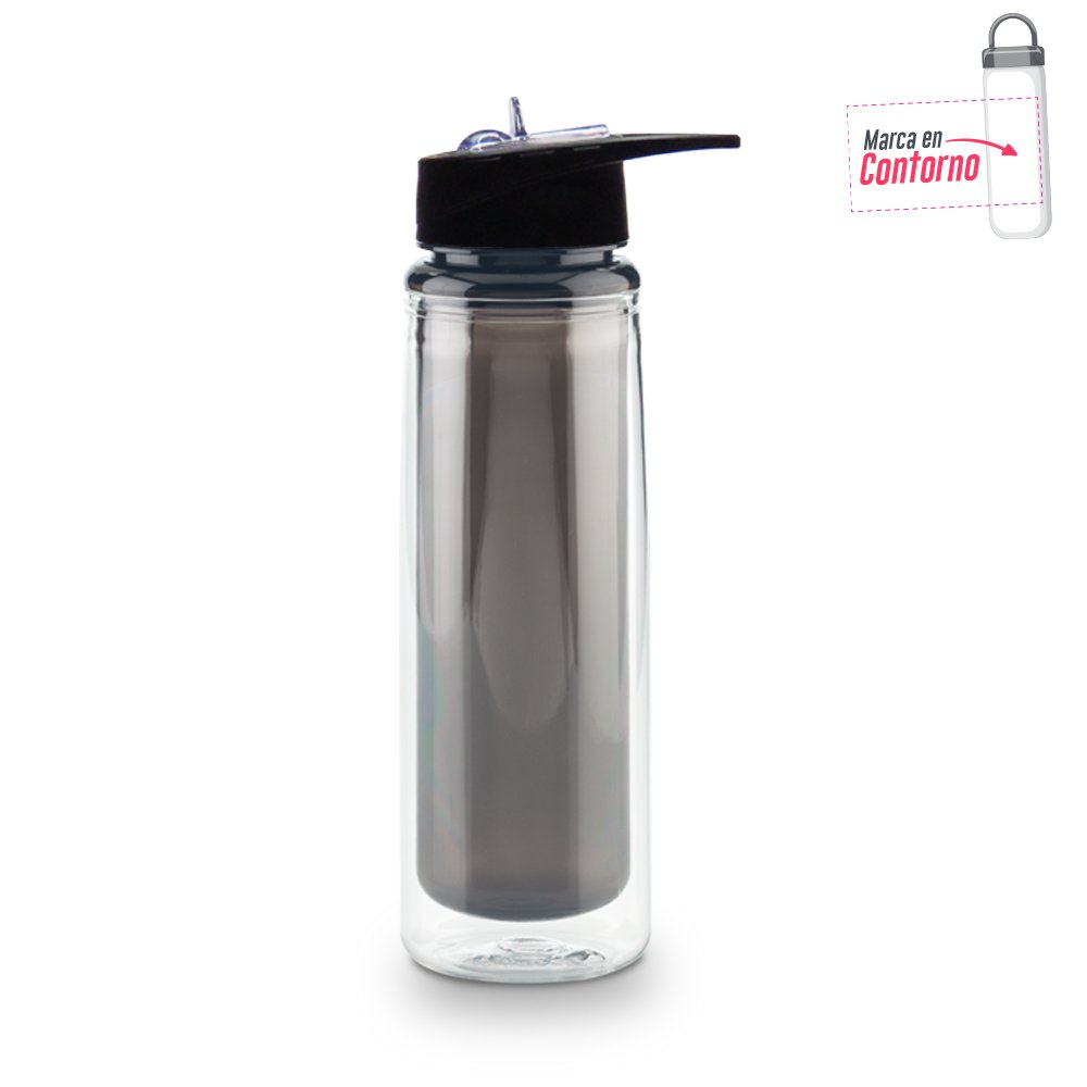 Botilito plástico doble pared en PETG. Tapa rosca con pitillo. Medidas: 25. 5 cm x 7.3 cm de diámetro. Marca: / Tampografía