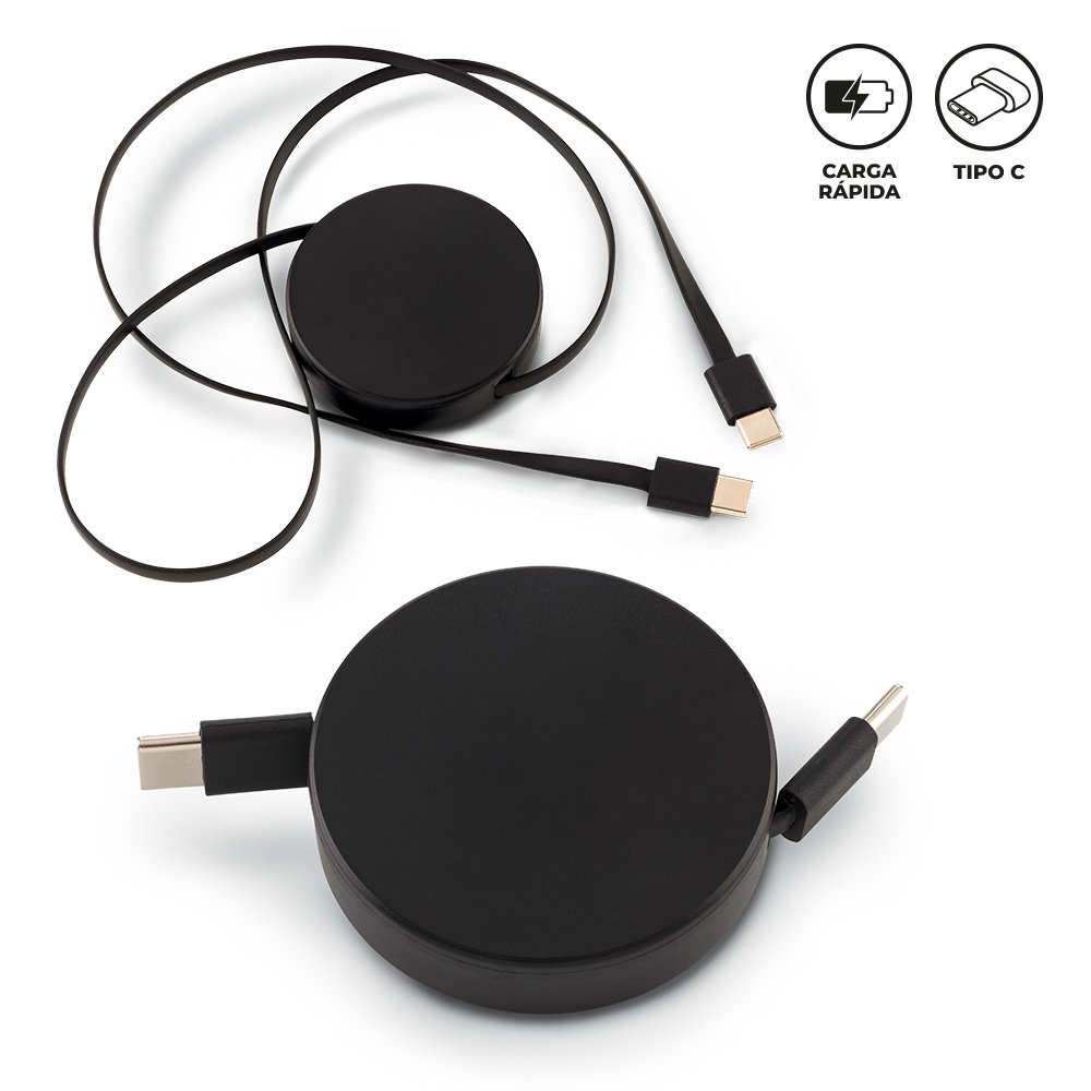 Cable plástico multicargador retráctil. Con carga rápida de 65W. Con conexión Tipo C. Medidas: 5 cm x 1.2 cm.