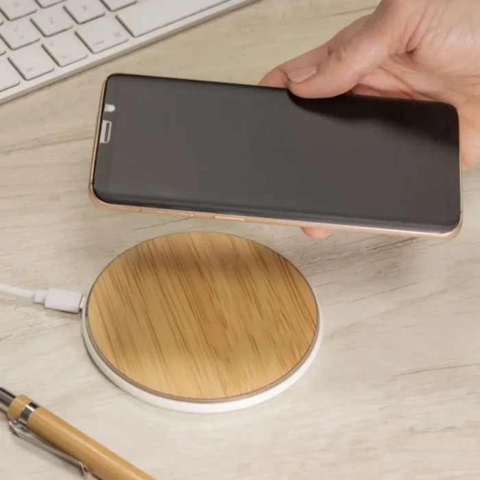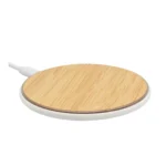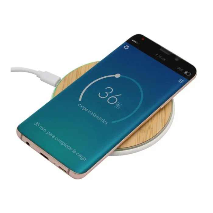 Bambú + Plástico ABS. Cargador inalámbrico. Base plástica color blanco con antideslizantes. Entrada: 5V/2A, 9V/1.1A. Salida: 10 watts. Distancia de transmisión: <