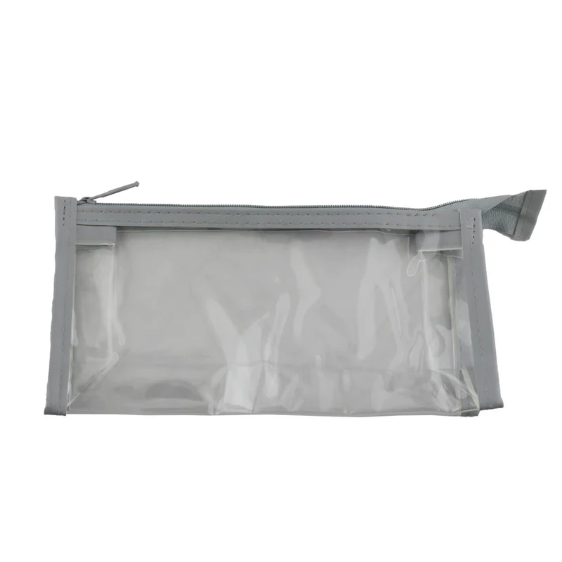Cartuchera en PVC transparente, con cremallera, zipper metálico en metal con aro. MEDIDAS: ALTO: 10.5 cm, LARGO: 21.4 cm, PROFUNDIDAD: 5.3 cm