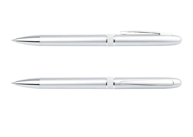 Bolígrafo con sistema de apertura Twist. Clip y punta plateada.