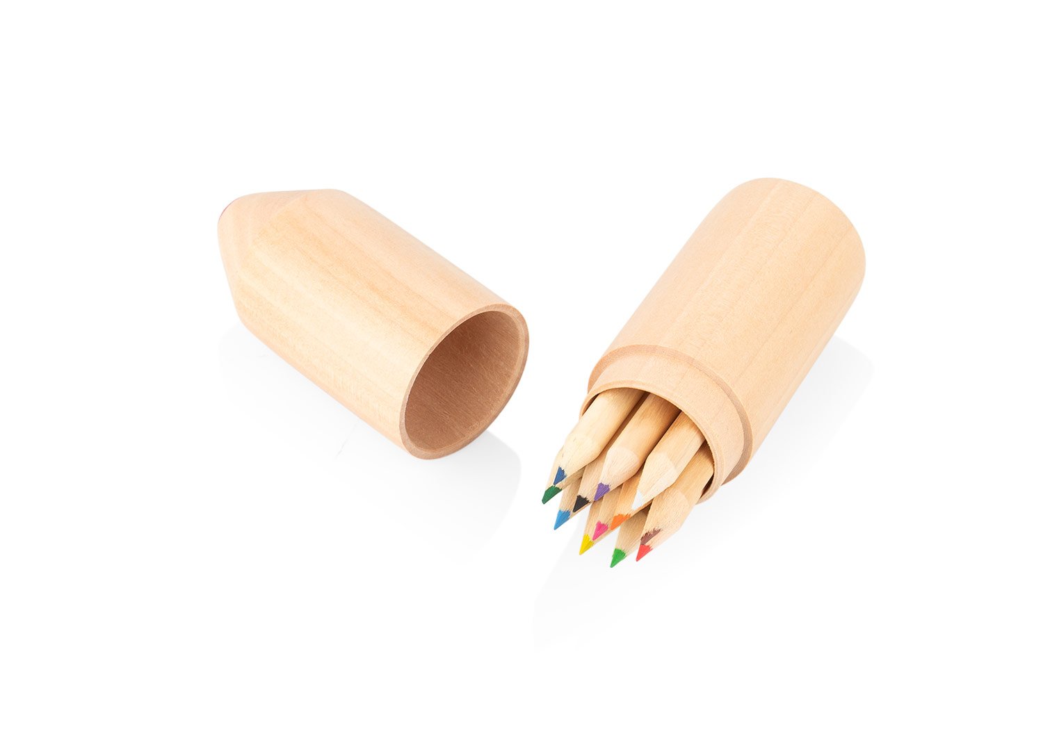 Este juego incluye 12 lápices de colores (8,7 X Ø 0,3) presentados en una caja de madera, ideal para mantenerlos organizados y protegidos. Su formato compacto facilita el transporte y almacenamiento, ofreciendo una solución práctica para actividades creativas dentro y fuera del entorno laboral. MATERIAL: Madera, MEDIDAS: Formato: (Alto X Diámetro): Con Tapa: (13,8 X Ø 2,8). Sin Tapa: (7,6 X Ø 2,8). Peso: 63 gr.