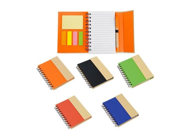 Cuaderno con argollado “doble O” y cierre magnético. Memos adhesivos, 4 juegos de banderas adhesivas en papel de diferentes colores por 25 unidades c/u de colores y bolígrafo de color similar. 60 hojas rayadas de 70 g. Con porta bolígrafo. Tamaño aproximado de las hojas: A6.