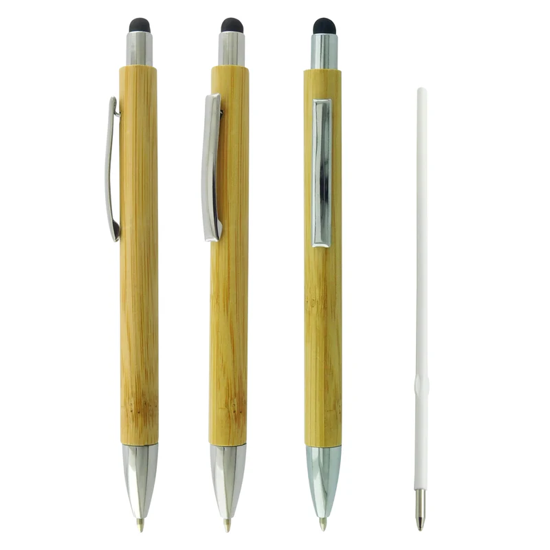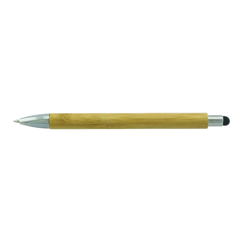 Esfero con cuerpo en madera de bambú. clip y puntas cromados, retráctil. Punta con estilo. (táctil).Medidas: Largo 14.2, Material:Bambú