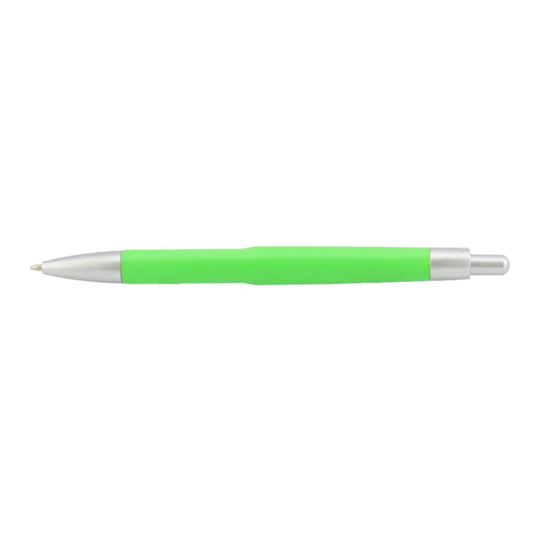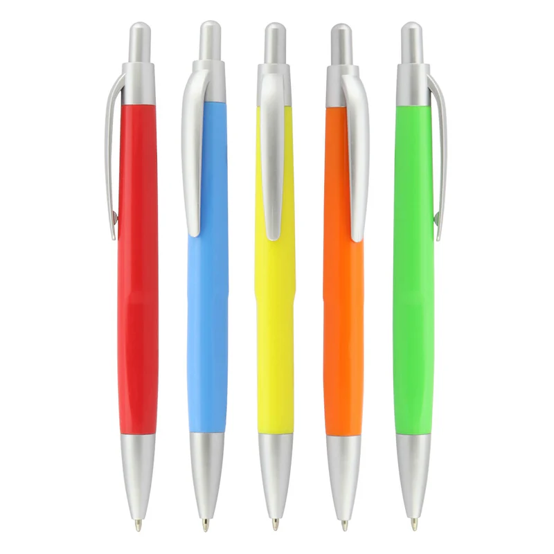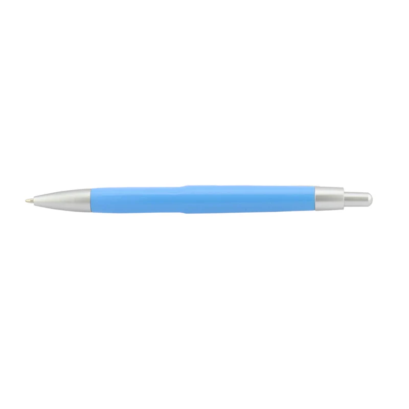 Esfero plástico con acabado brillante, cuerpo de color, parte superior y punta de color plata. Medida: Largo: 13.6 cm