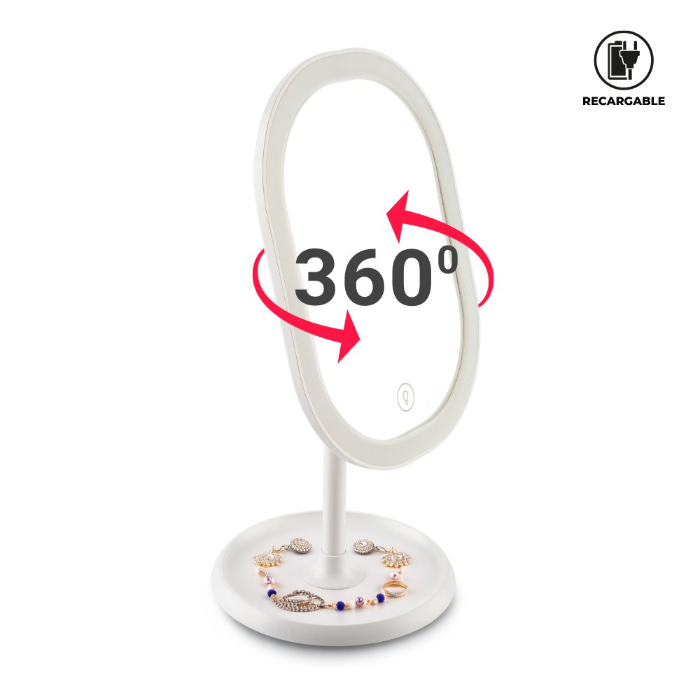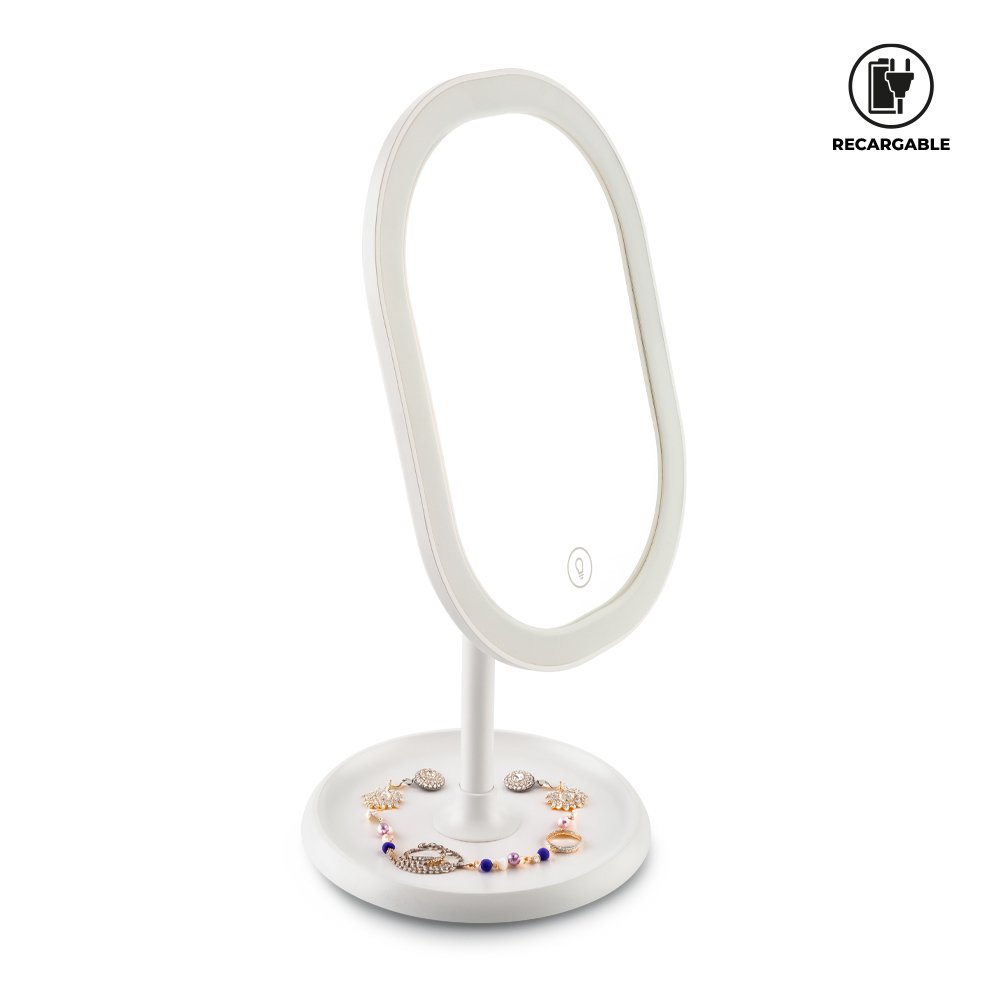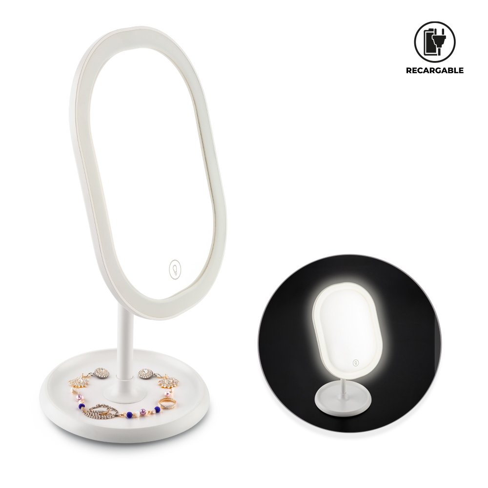 Espejo plástico con luz led y base. Con batería recargable de 1000mAh. Tres modos de luz. El espejo rota 180° hacia adelante y hacia atrás. Incluye cable Tipo C para carga. Empaque caja individual. Medidas: 26 cm x 13 cm diámetro de la base. Marca: 4 cm / Tampografía.