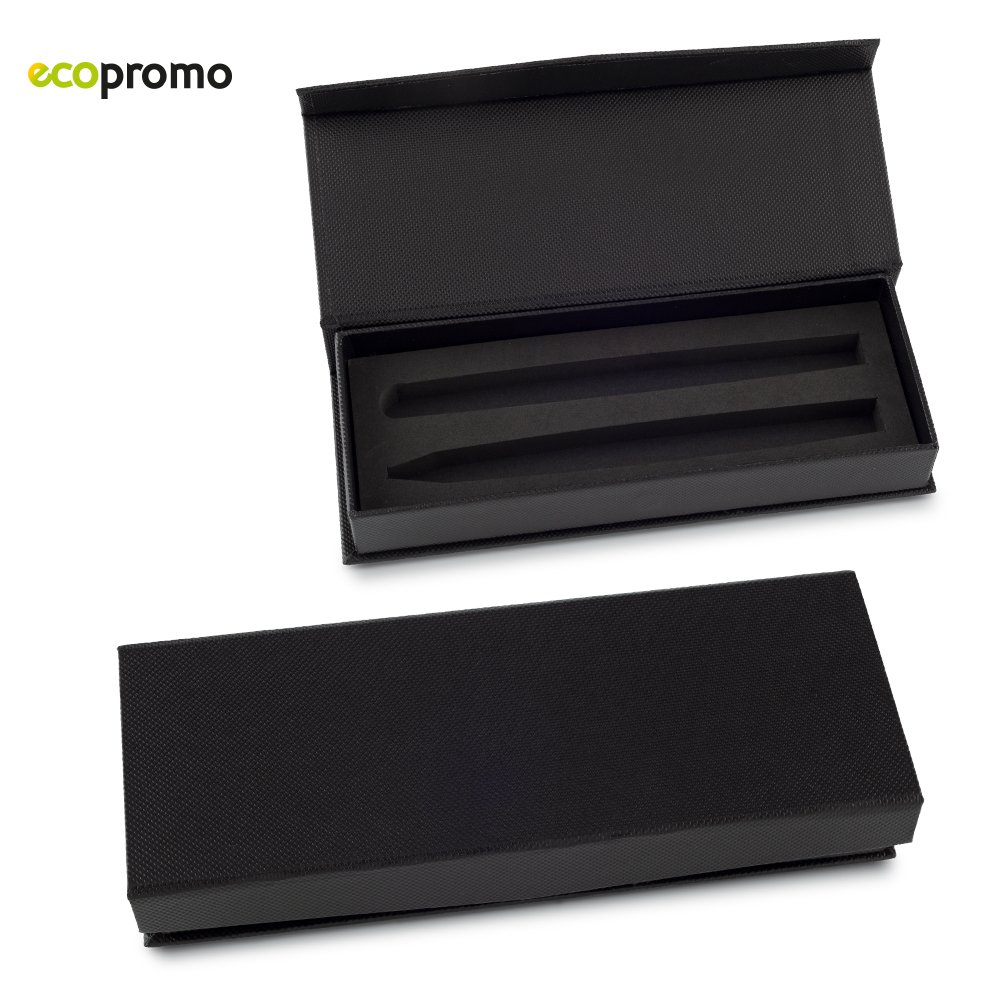 Estuche en cartón con cierre magnético para 2 bolígrafos. Medidas: 17 cm x 6.4 cm x 3.6 cm.
