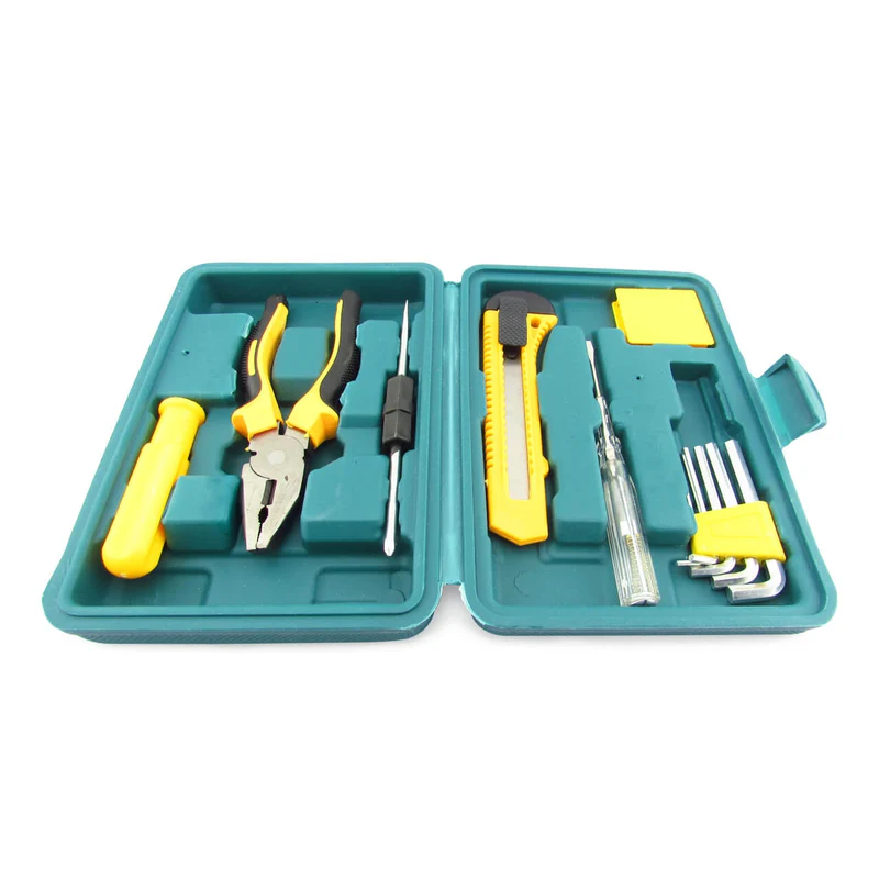 Juego de herramientas: Alicates, bisturí, llaves bristol, metro, tester y destornillador. medidas: Ancho : 13.5cm, Largo:19.5cm, Profundidad: 4cm