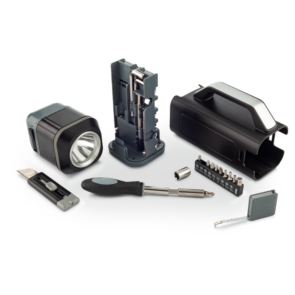 Set de herramientas plástico de 24 piezas con linterna. La linterna incluye 4 modos diferentes de uso. Incluye cable Tipo C para carga. Empaque caja individual. Medidas Caja: 24.7 cm x 10.5 cm x 7.5 cm. Marca: / Tampografía con empaque y desempaque.