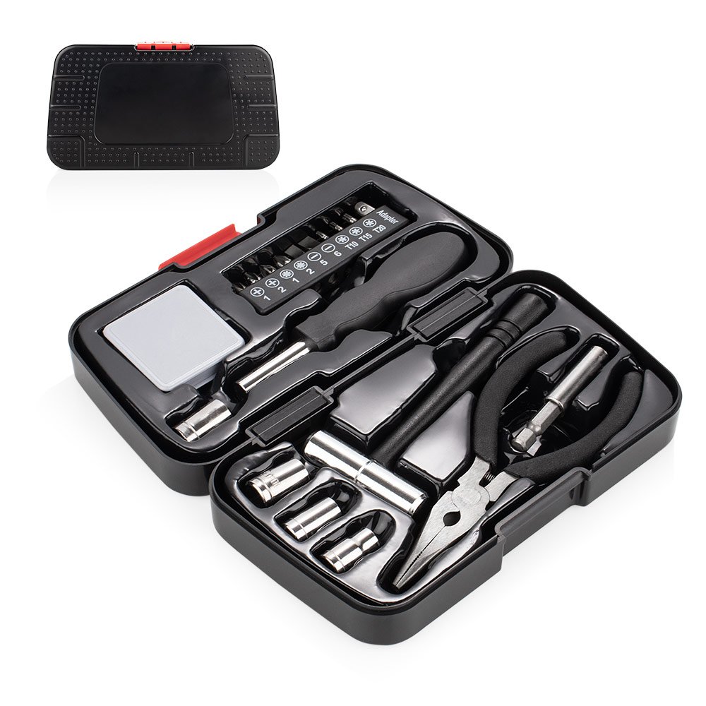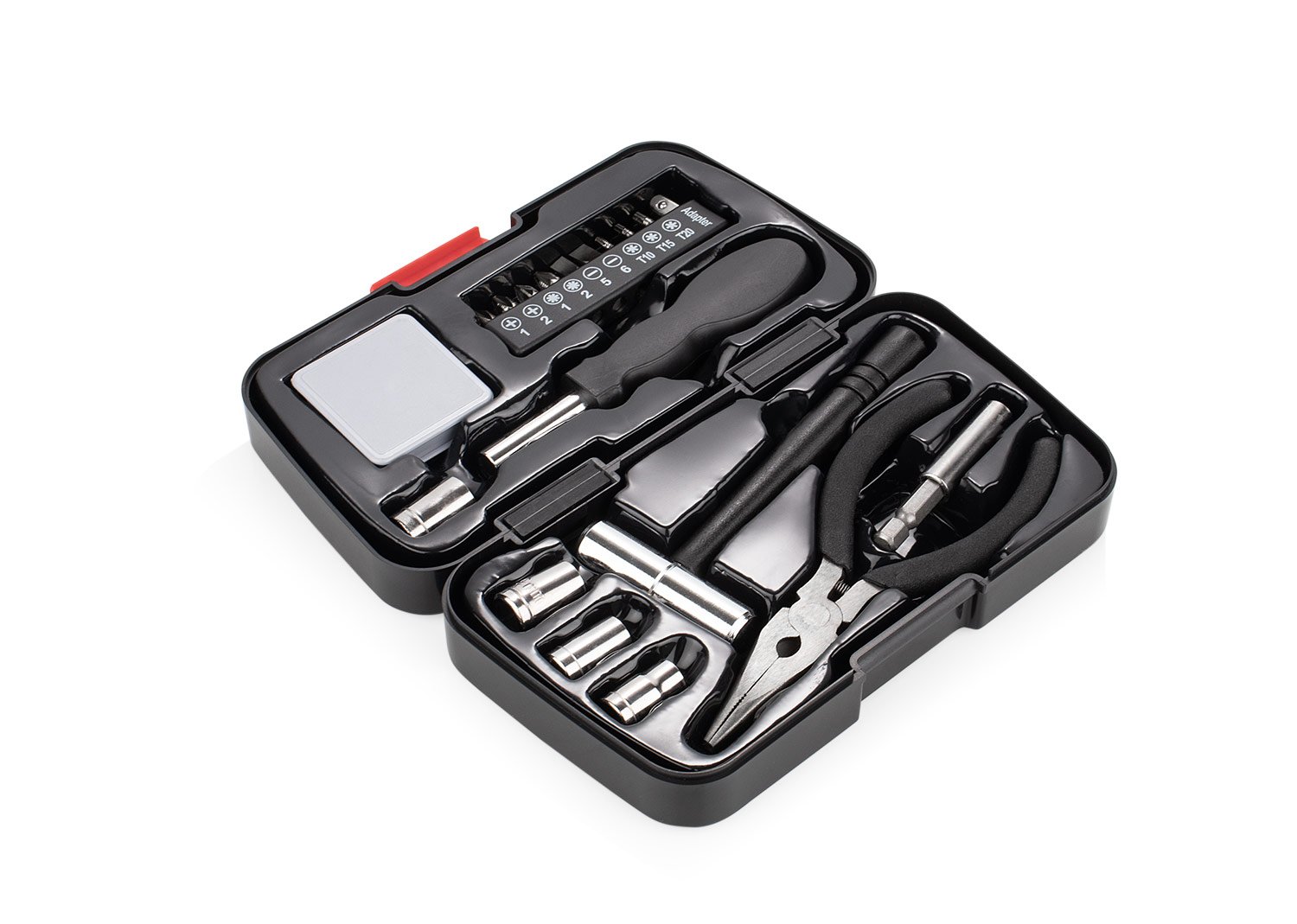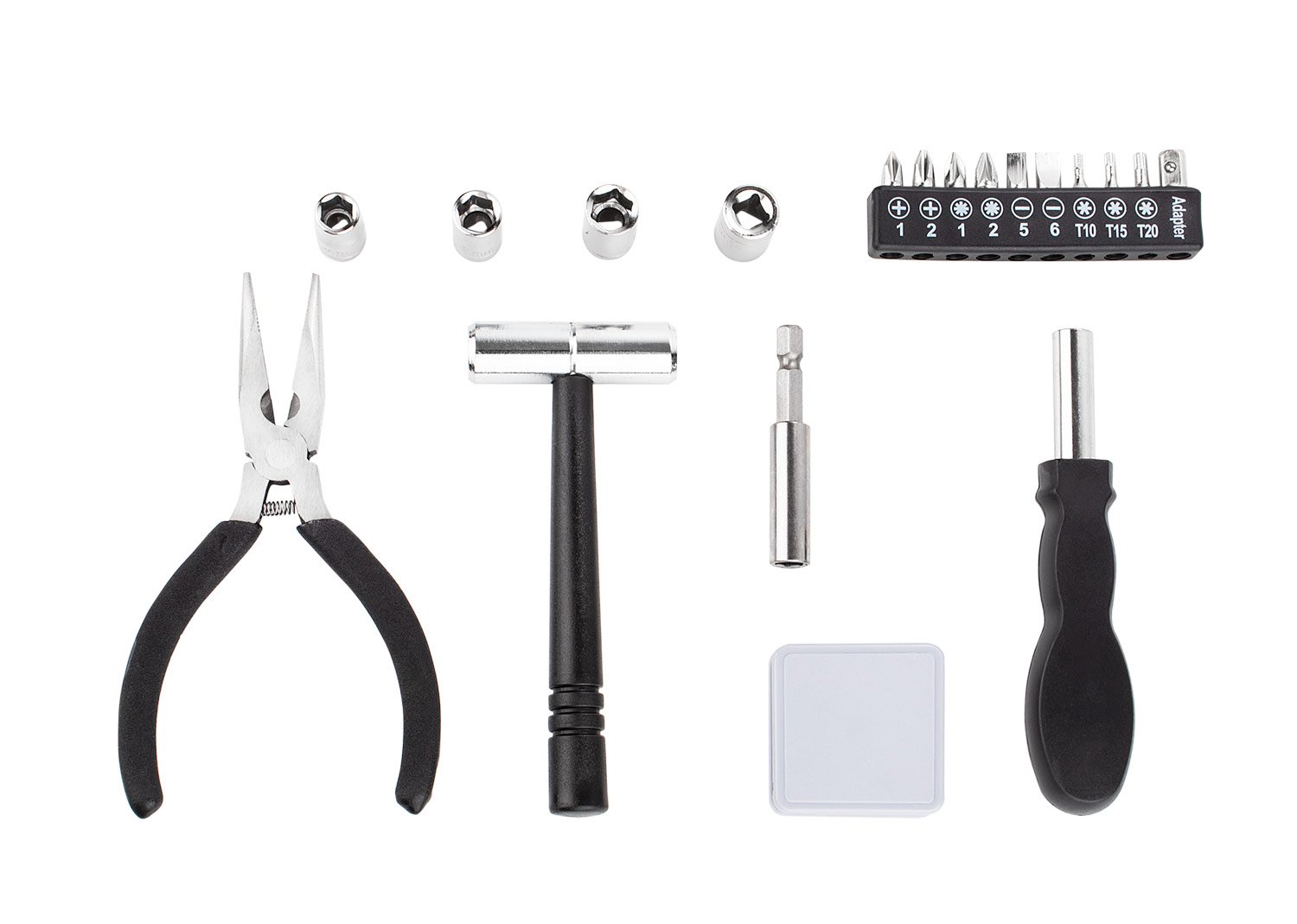 Set de herramientas que incluye: Destornillador con 4 puntas tipo Phillips, 2 tipo pala, 3 de precisión, 1 adaptador de copa, 1 extensor, 4 copas de 10, 9, 8 y 7 mm, pinza con cortafríos, martillo y cinta métrica de 100 cm.