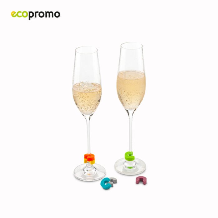 Identificador de copas y vasos en silicona con base en madera. Incluye 12 identificadores en colores surtidos. Medidas: 12 cm x 2 cm diámetro. Marca: / Láser.