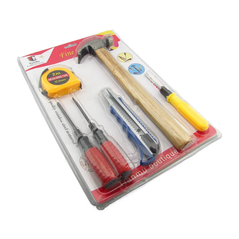 Contiene: Metro, dos destornilladores, bisturí, Martillo, y destornillador doble. MEDIDAS: ANCHO: 23.7cm, LARGO: 34.5cm