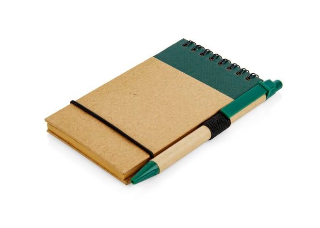Libreta ecológica con argollado “doble O” color negro y resorte de ajuste, bolígrafo de color similar incluido y practico porta bolígrafo. 60 hojas rayadas en papel reciclado. Tamaño aproximado: A7.