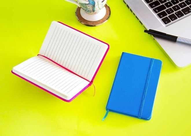 Libreta con cubierta en PU de colores neón. 80 hojas rayadas de 70 Gramos. Tamaño aproximado: A6.
