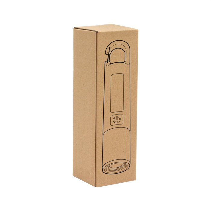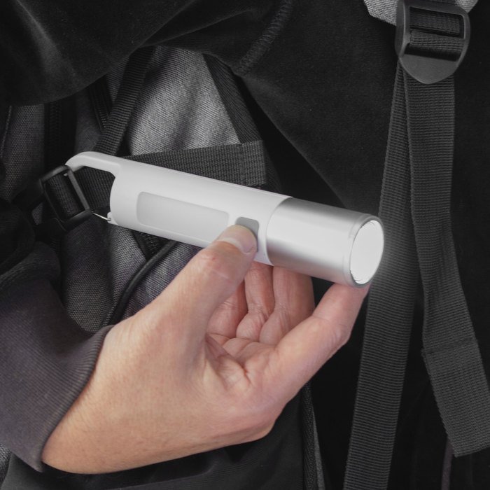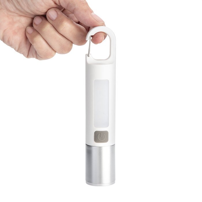 Linterna portátil recargable. Con mosquetón incorporado. Luz de emergencia y 2 intensidades de iluminación (alta e intermitente). Batería recargable 800 mAh. Fuente de luz 7 leds de alta potencia. Puerto USB-C oculto (se desplaza el cuerpo hacia arriba). Cable de carga color blanco.  Medidas: Ø 3 cm x 15,8 cm.