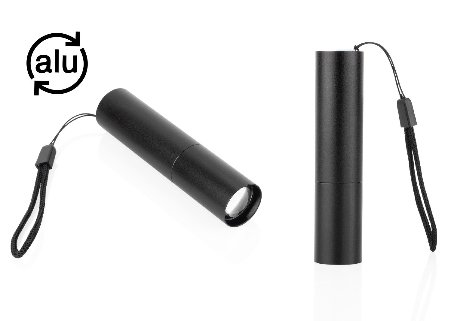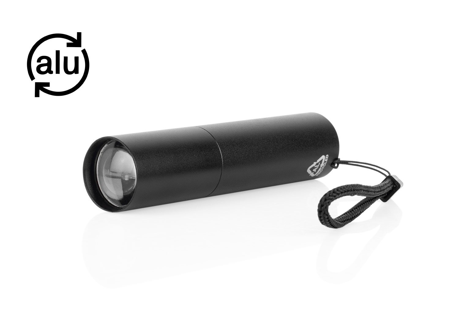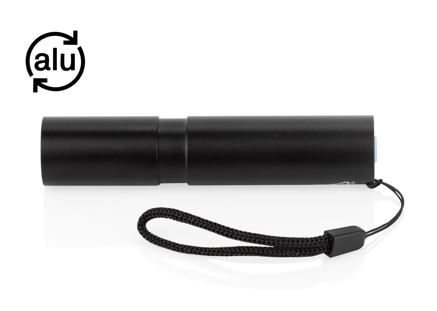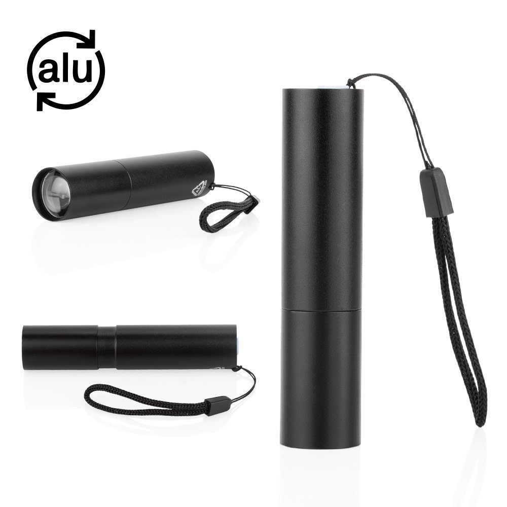 Linterna recargable de alto rendimiento con 110 lúmenes y 3 modos de luz ajustables, que se controlan mediante un botón ubicado junto al puerto de carga. Su diseño incluye función zoom in/out, permitiendo enfocar o ampliar la iluminación deslizando el cuerpo de la linterna. Equipada con batería interna de 400 mAh, cable de carga incluido y práctico cordón para llevarla cómodamente. Ideal para uso diario, actividades al aire libre o emergencias. MATERIAL: Aluminio reciclado, MEDIDAS: Formato: (Alto X Diámetro): (9,3 X Ø 1,9). Peso: 42 gr.