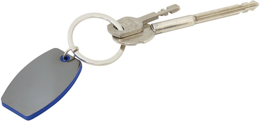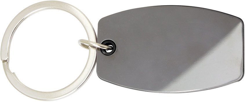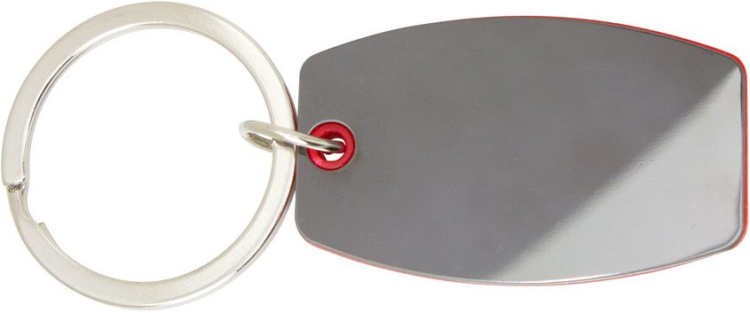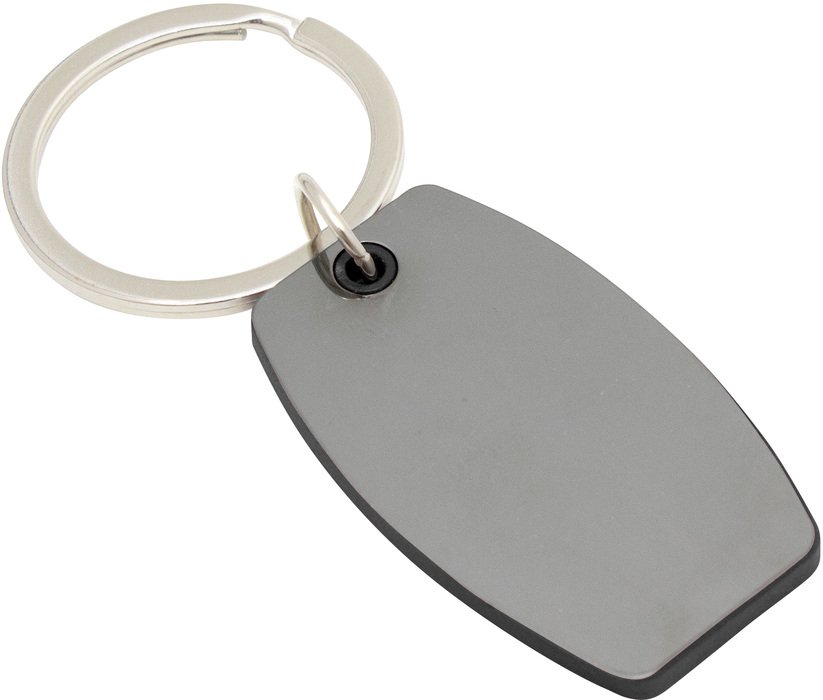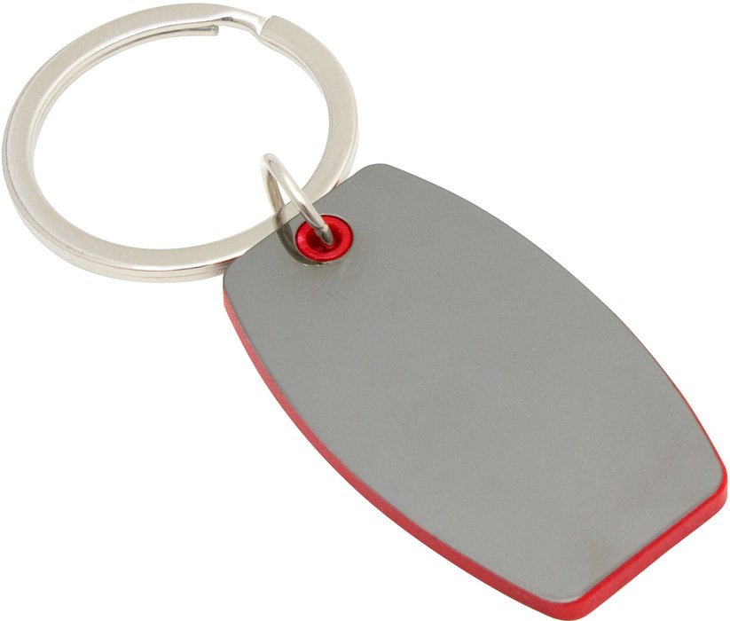 Llavero con forma ovalada. Estructura plástica de color con apliques de acero color gris gun de cada lado. Acabado brillante. Medidas: 5 x 3 x 0,35 cm. LLavero de Ø 3,5 cm x 0,2 cm. Materiales: Hierro, ABS y Acero.