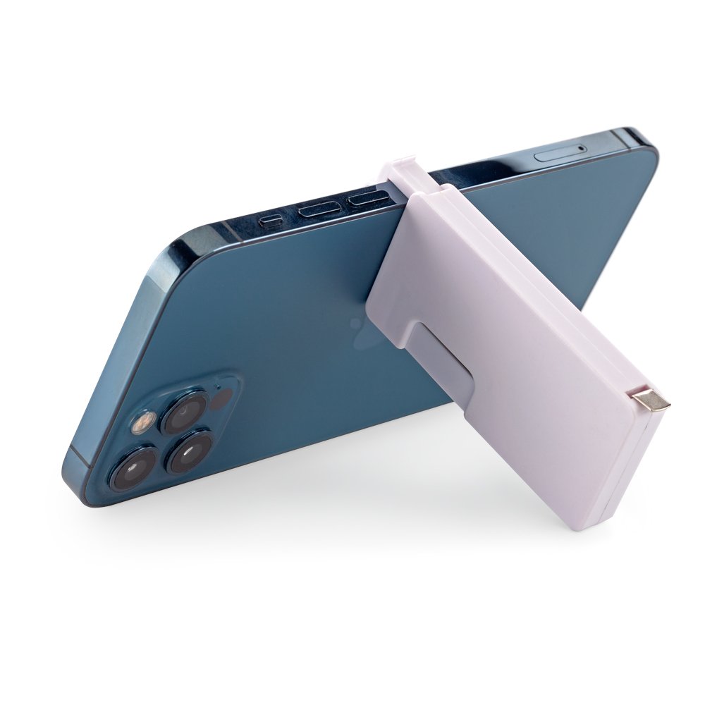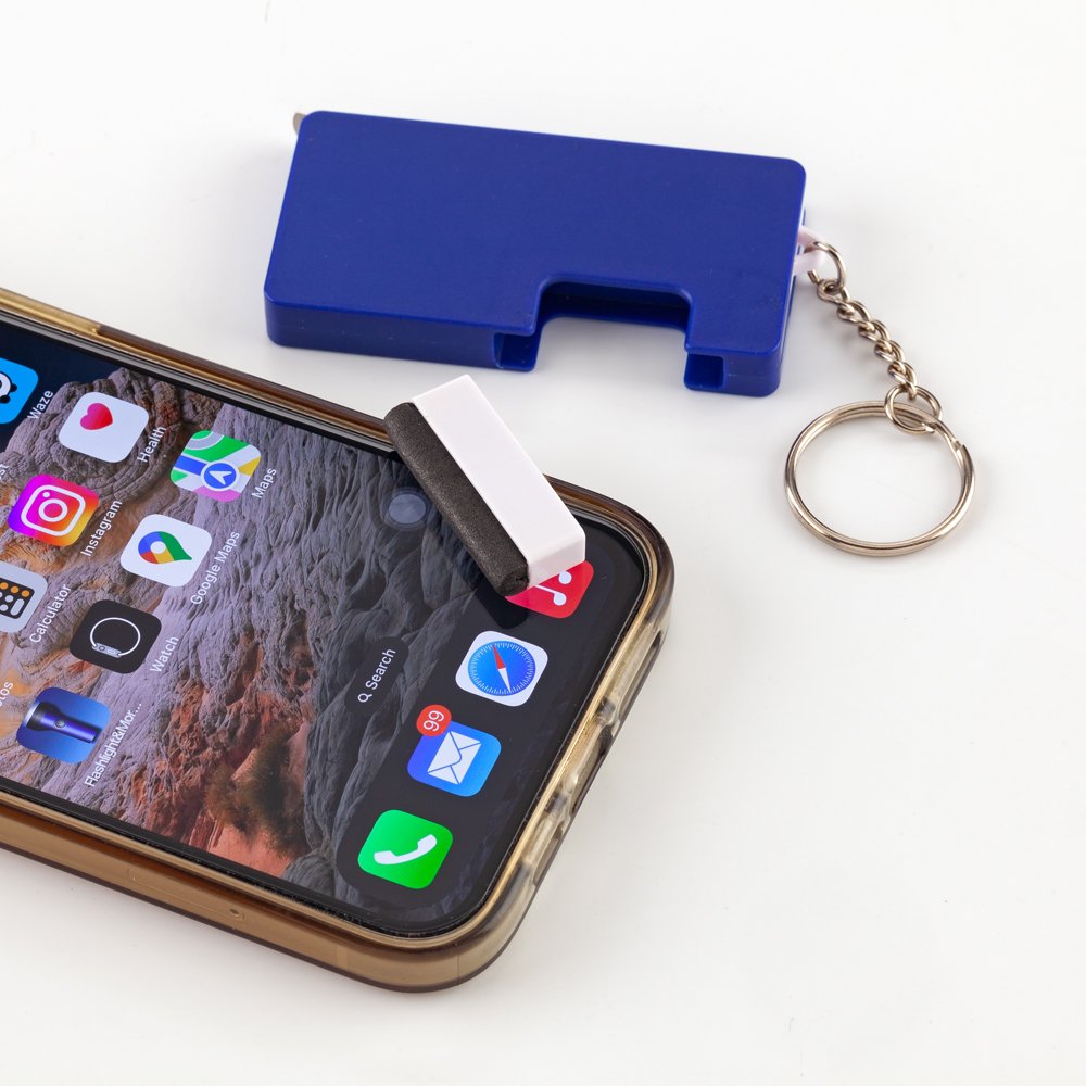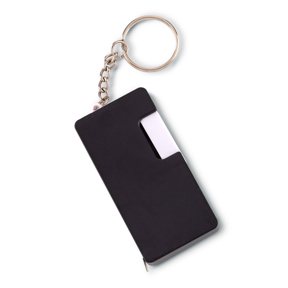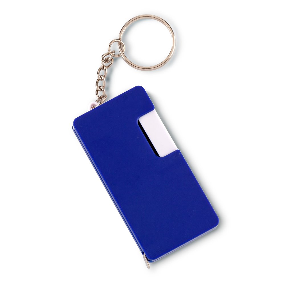 Llavero plástico con metro de 1 mt, soporte para celular y limpia pantallas. Medidas: 7 cm x 3.5 cm x 1 cm.