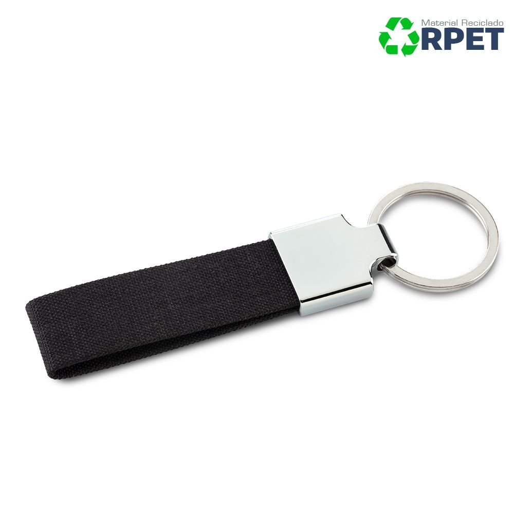 Llavero en poliéster reciclado RPET y metal. Empaque caja individual. Medidas: 12 cm x 3 cm. Marca:/ Tampografía