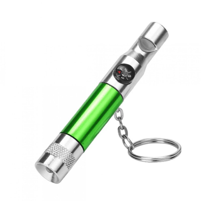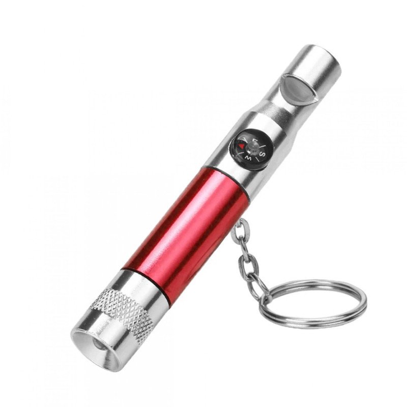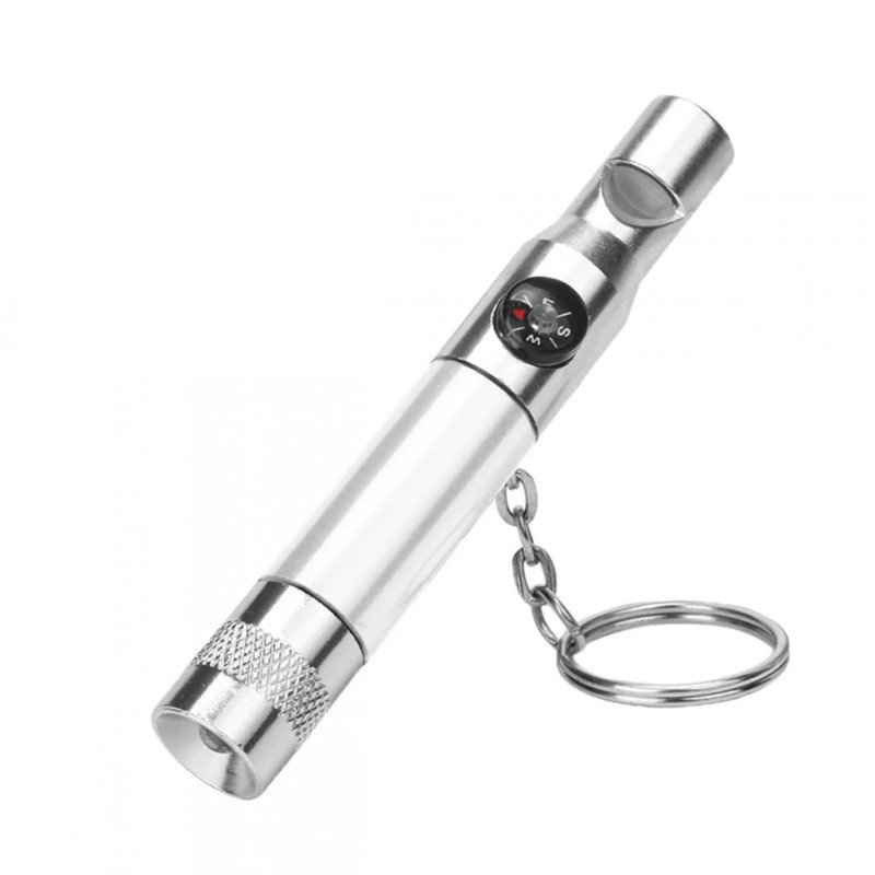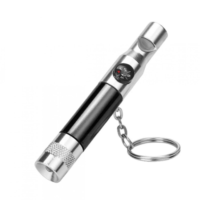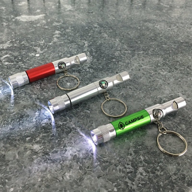 Silbato metálico con brújula y linterna LED. De 9,3 x 1,3 cm.Impresión: Tampografia metálica – Grabado laser