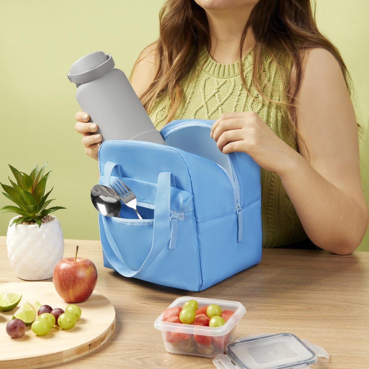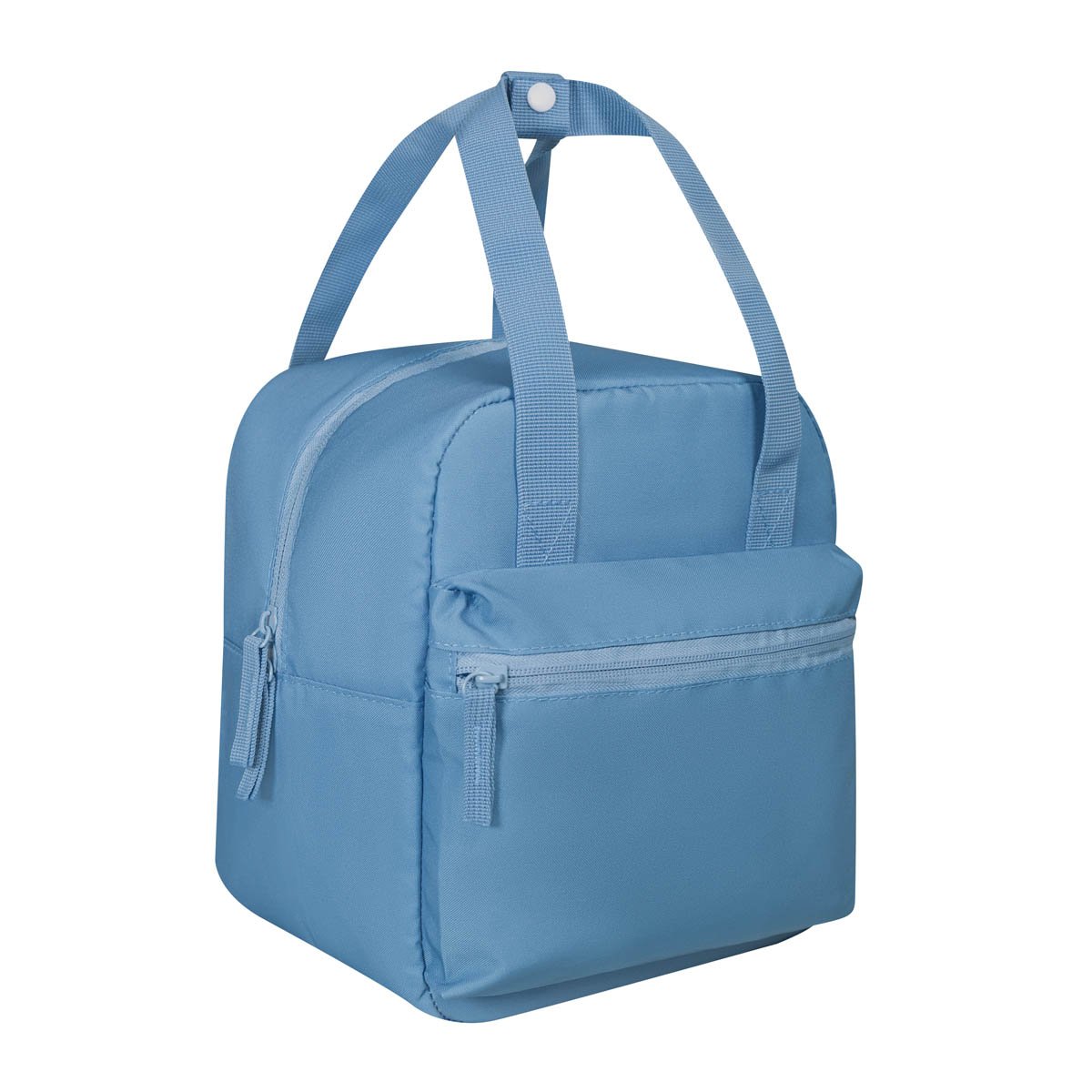 Lonchera fabricada en poliester resistente y duradero, cuenta con un forro plastificado que facilita su limpieza. El compartimento principal, tiene un cierre y un bolsillo frontal para llevar objetos pequenos como, cubiertos, snacks o utensilios. Sus dos asas superiores facilitan su traslado y se pueden unir con un practico broche para mayor comodidad. Con una capacidad para 9 latas, esta lonchera es ideal para llevar tus comidas y bebidas favoritas de manera segura y organizada. MATERIAL: Poliester / Acetato de vinilo de polietileno TAMAÑO: 21 x 23 x 20 cm