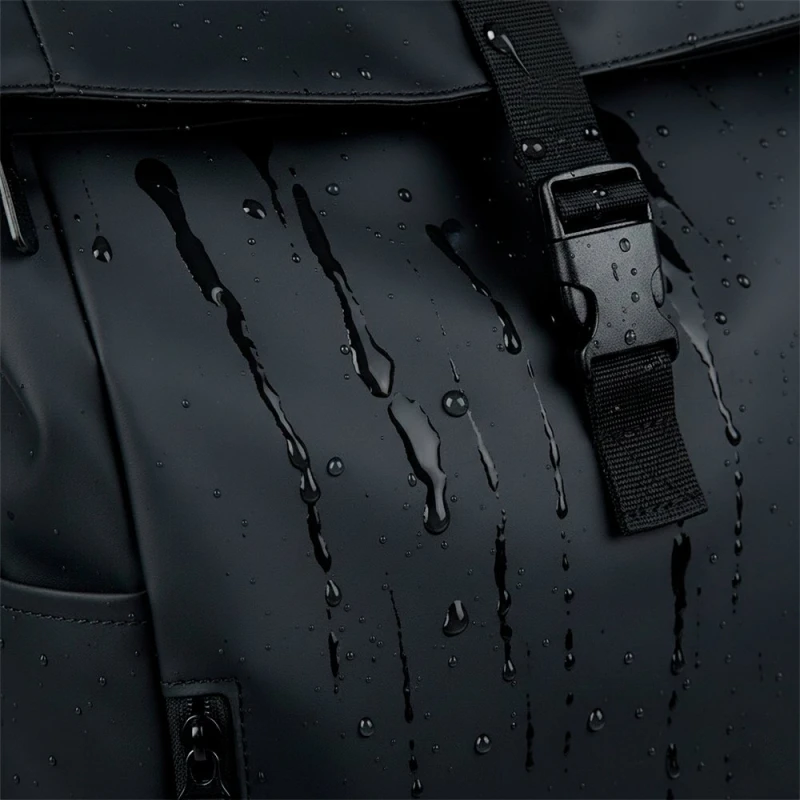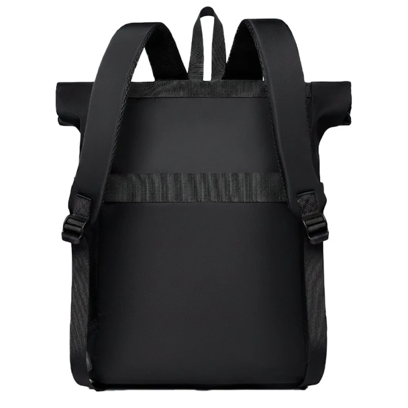 Maleta roll top en material PU impermeable, con bolsillo expandile para portatil, doble bolsillo lateral con cremalera y doble bolsillo tipo sobre para bebidas. Capadicad 35 litros / 8 kilos. Tirantas acolchadas. De 42 x 32 x 17 cm (enrollada)