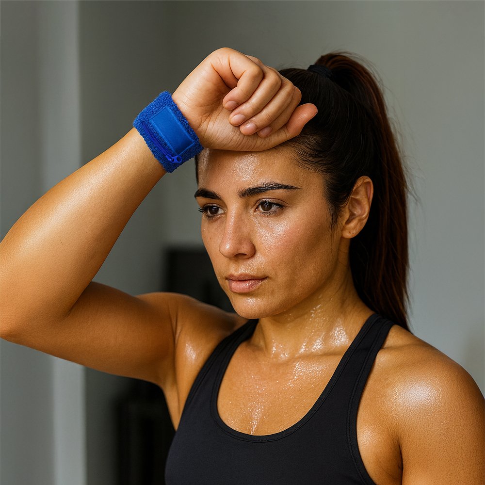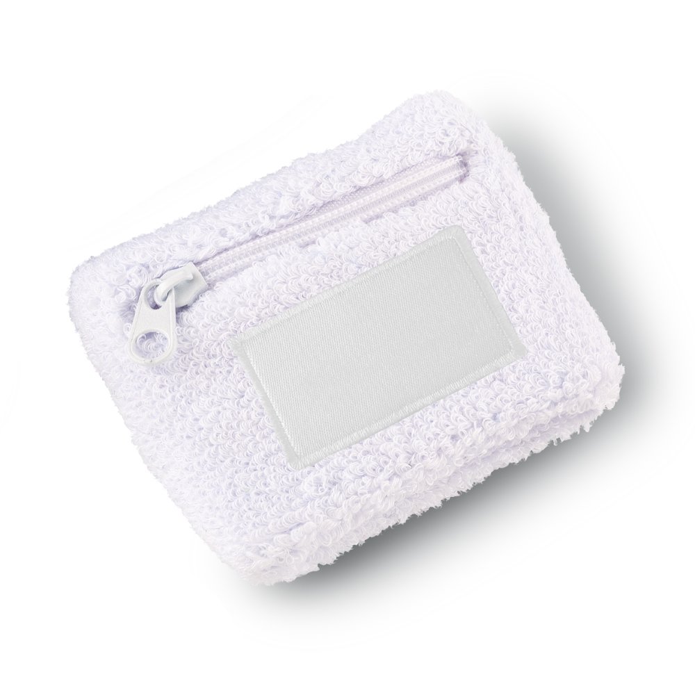 Muñequera deportiva para el sudor en poliéster. Incluye un bolsillo con cremallera y parche para el logo. Medias: 8 cm x 6.5 cm. (Parche para logo).